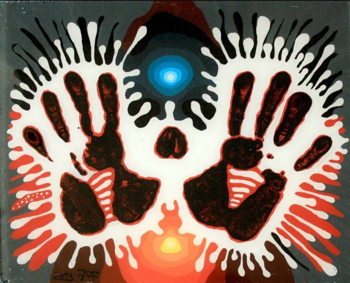 В левом углу можно было увидеть парящую глыбу в форме трапеции, из днища которой били яркие молнии. Чуть правее находилась объятая лавой пластина из камня. На ней сидела огромная черная тварь с огромными когтями на массивных передних лапах. Из жуткой сюрреалистичной морды отходило три остроконечных отростка, два по бокам, и один на лбу. Бока мохнатого загривка обтекали две дугообразные линии золотистого цвета, концы которых замыкались в круги, а массивную шею овил диковинный ошейник, из центра которого также вытекала замыкающаяся кругом линия, завершая боковые. Впрочем, сравнить это можно было с перевернутой короной из завитков, или обычной подвеской, но каждый видел в этой репродукции то, что хотел.