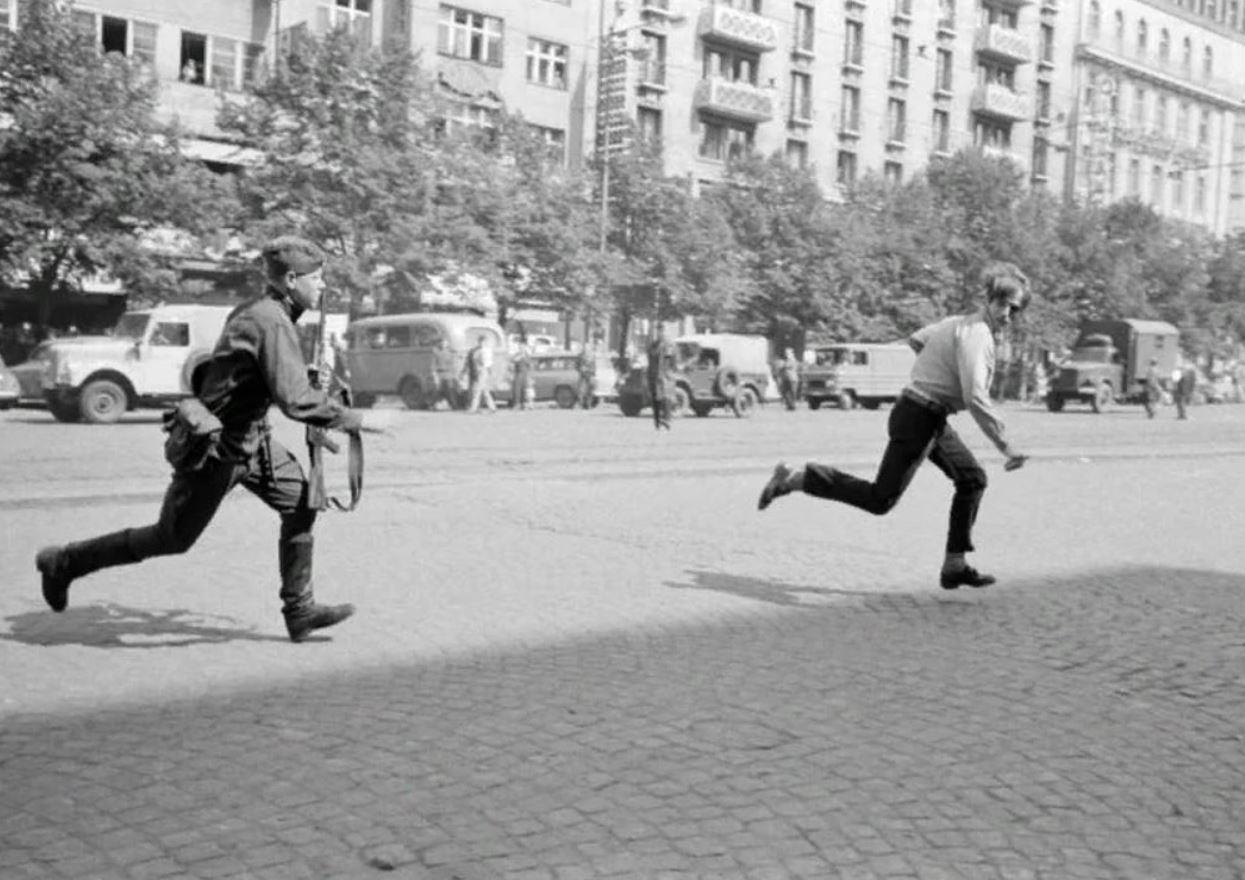 А это фото демократического фотографа, снимающего адские преступления советской военщины в мирной Пражской весне 1968 года. Беспощадная советская военщина преследует за инакомыслие бедного чешского студента.