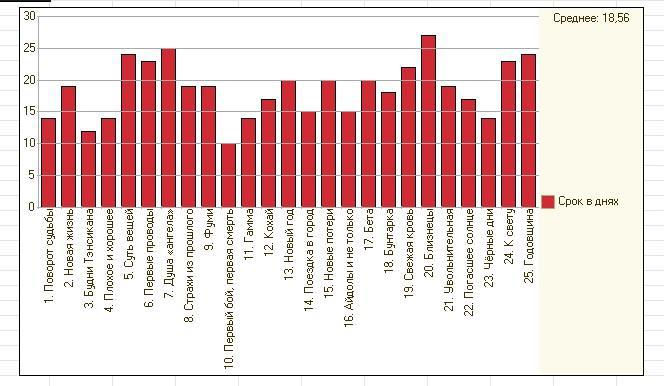 В общем, чтобы понять, насколько нынешний кризис кризисный, собрал статистику по времени написания глав (собственно написание + редактура). Картинка получилась забавная, рекордсменом тут почему-то является 10-я глава, которая когда-то, ещё в самом начале, казалась мне очень сложной. Но тут, возможно, сказался тот факт, что работа над ней пришлась на майские праздники, и в преддверии наступающего лета получилось эффективно потрудиться.