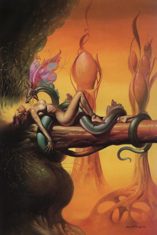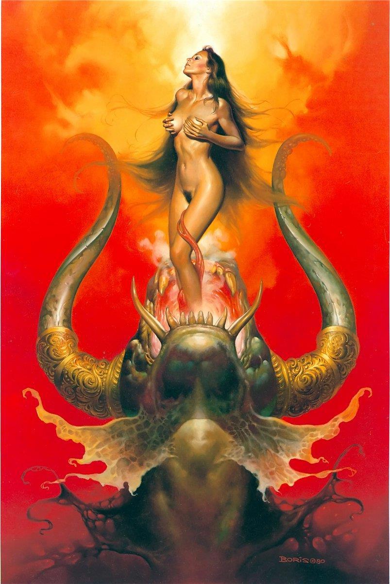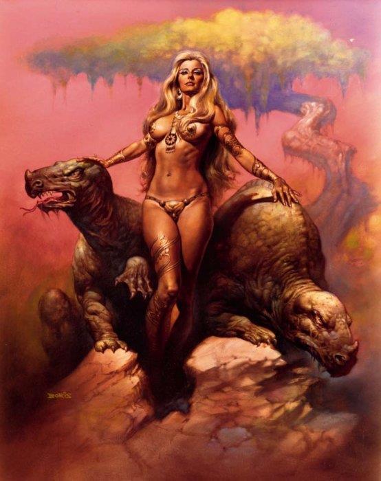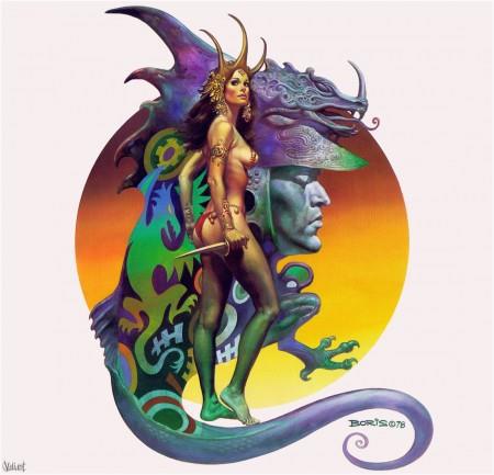 Приведенные ниже работы Бориса взяты, в основном, из периода семидесятых-восьмидесятых годов двадцатого века. Они сильно отличаются от работ, начиная с девяностых, когда стиль мастер астал гипертрофированно реалистичным в плане прописанной мускулатуры, неестественных поз, больше присущих культуристам на "Мистер и мисс Олимпия". Немудрено, учитывая его новую страсть и музу. полностью разделявшую с ним оба важнейших увлечения: фантастическую живопись и тягание металла. Речь о второй супруге художника, Джулии Белл, не менее известной в фантастике и фентези своими работами: