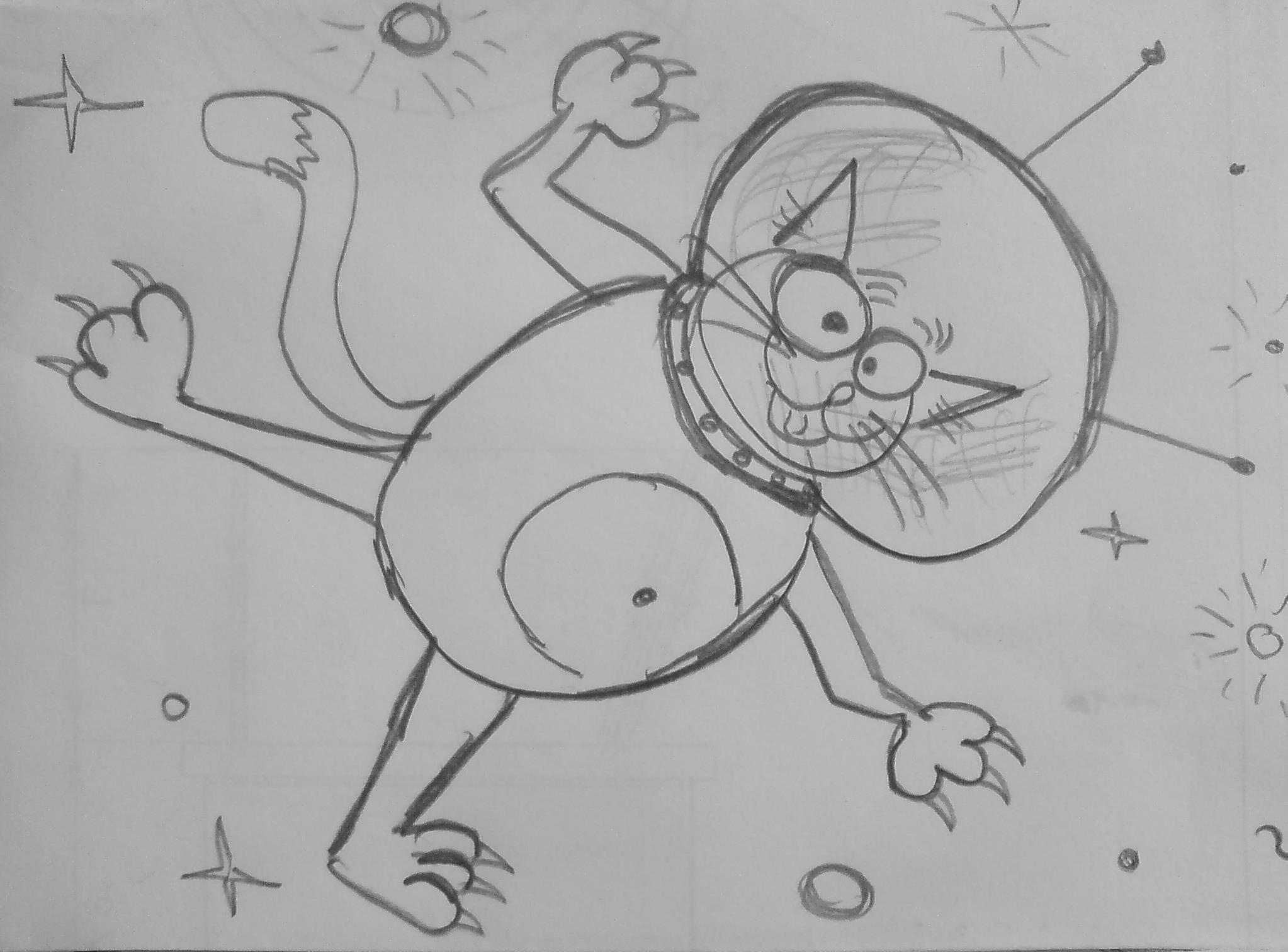 Крупных обёрточных кусков в поле обозрения уже не наблюдалось, потому пришлось творить на том, что Бог пошлёт. То, что послал Бог, биван тут же притащил из своей кладовки. Это были рулоны крупногабаритной туалетной бумаги. Сцепив скотчем несколько оторванных от рулона полос, я начеркал на свежеисполненном холсте уродливое подобие котика, одетое в уродливое подобие скафандра, за пару минут. Вместе с Нуу я отправился сдавать работу гиилунянину.