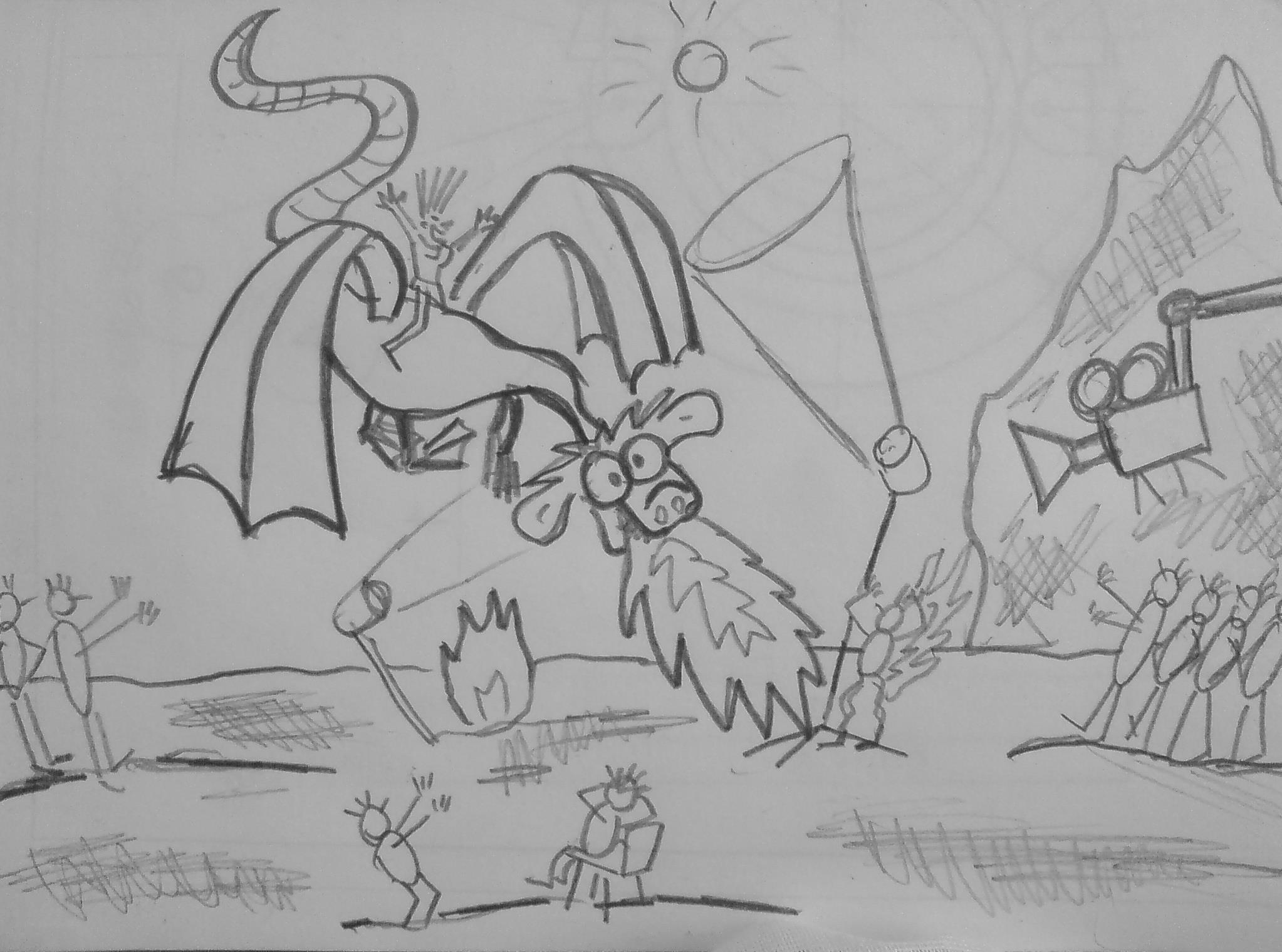 ИПрямо на поле посадочной площадки я разложил самый крупный кусок упаковки, который гиилунянин не успел искромсать. Его я и предположить обозвать холстом для будущей картины. Подаренный Бергамотом 268-ым карандашик оказался на моё счастье самым простым и обычным, несмотря на его внешнюю жёлто-голубую окраску. Рисовал я, как кура лапой, а потому — быстро, и через десять минут уже тащил дипломату свой рисунок, выполненный в манере шестилетнего ребёнка. На холсте я, как мог, изобразил и дракона, и пламя, и кучку людей, включая режиссёра, оператора и сгоревшего осветителя. Больше всех мне понравилось рисовать оседлавшую дракона даму, даже сам не понимаю, почему. Очень надеясь на правдивость откровений бивана Нуу относительно творческой разборчивости гиилунян, я рискнул показать Харе своё искусство. Ведь, если он распознает подделку, не распознать которую было бы невозможно любому здравомыслящему существу, то мне светил довольно безрадостный финал жизни.