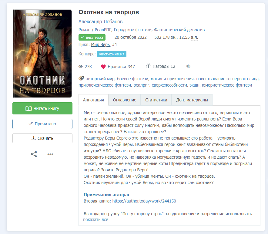 Люблю хорошие детективы, хотя вот сам их писать не умею. А тут детектив в антураже фэнтези, магии и сверхъестественного. Такое, конечно, может не каждому зайти. Но автор распространяет первый тем абсолютно бесплатно. Так что вы зайдите на страничку книги, почитайте, вам вполне может прийтись по духу это произведение.
