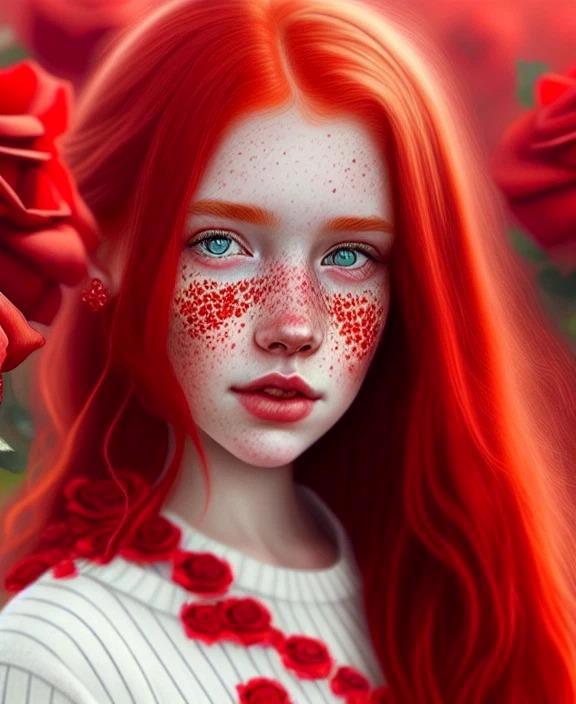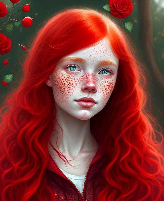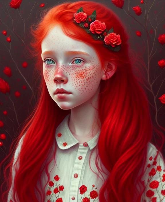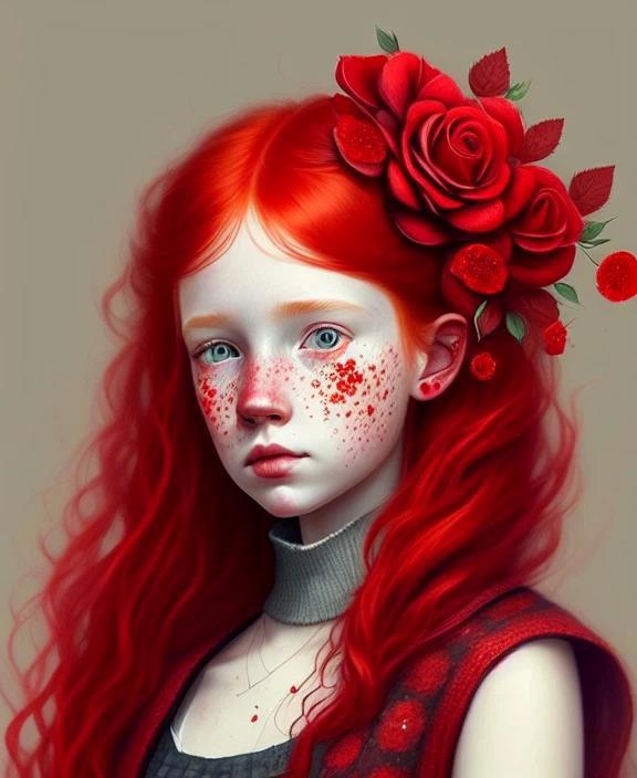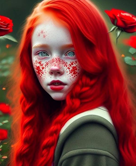 А вот это: Red-haired girl with freckles covered in scarlet roses