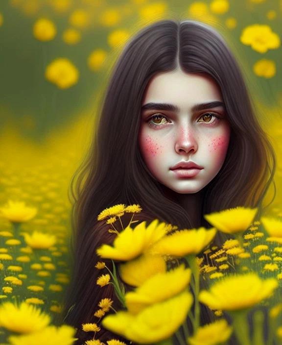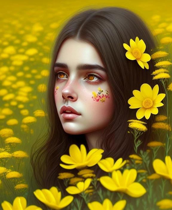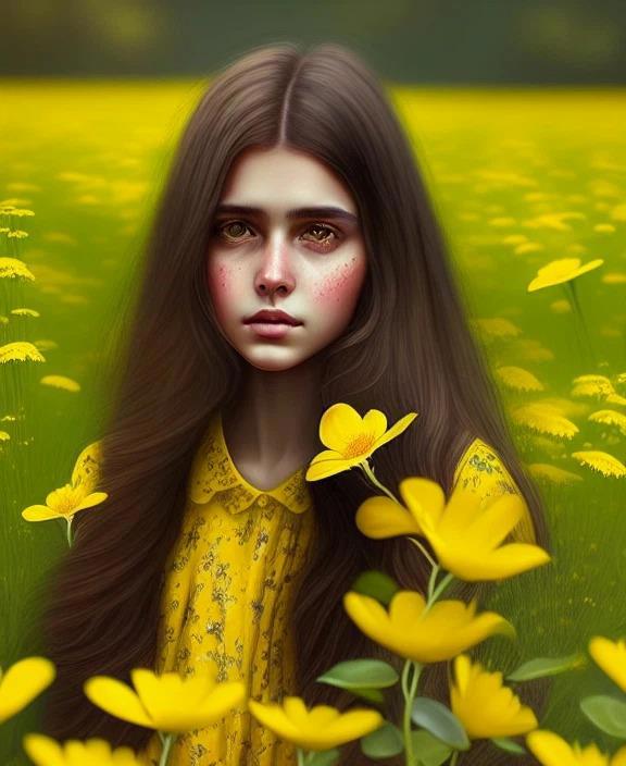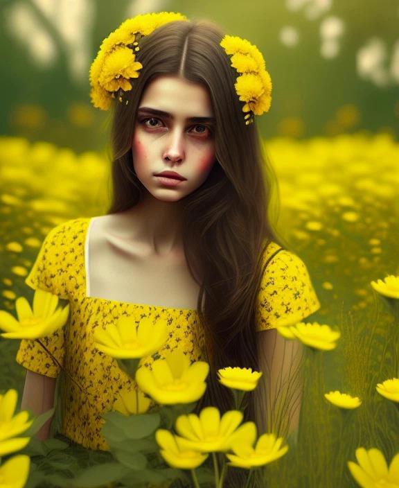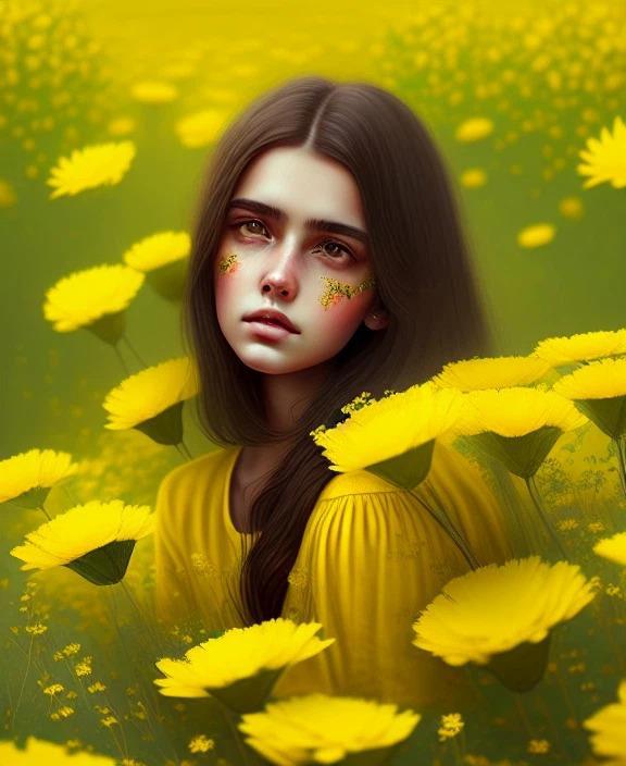 Ну и по традиции предложить Вашему вниманию ряд нейросетевых картинок на эту тему. Нижепоказанные картинки сгенерированы мной самим на базе нейронной сети Dreamlike. Запрос следующий: Beautiful brunette in yellow flowers.
