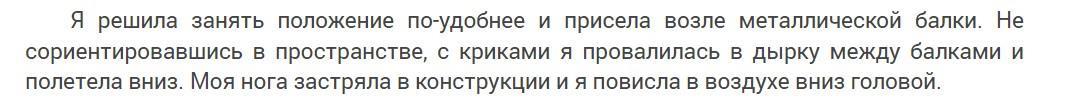 Так вот, с лестницы меня спустили – это вы уже знаете. Потом меня попеременно откуда-нибудь роняли или где-нибудь запирали. Уронили на занятиях по акробатике, и я «головой на ручку от окна прилетела». Заперли в полуголом виде в стеклянной будке на сцене. Уронили на сцену с троса. Заперли на всю ночь в душевой. Как-то это мне уже немного поднадоело. Или вот такая была ещё веселуха: