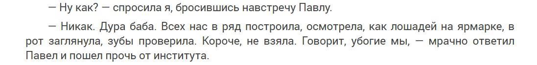 На прослушивание я шла, «как робот, сотрясаясь и дёргаясь». Комиссия меня первым делом попросила задрать платье и показать ноги. Потом почитать стих и спеть. Потом меня выгнали. И тут чисто случайно мимо проходил по коридору мужчина, «весь его вид выдавал в нём человека творческого» – неожиданно, да? Он сообщил, что мои всхлипывания мешают ему работать, и дальше целый час со мной общался и слушал, как я читаю и пою. Пение он сначала слушать не хотел, но я его убедила: