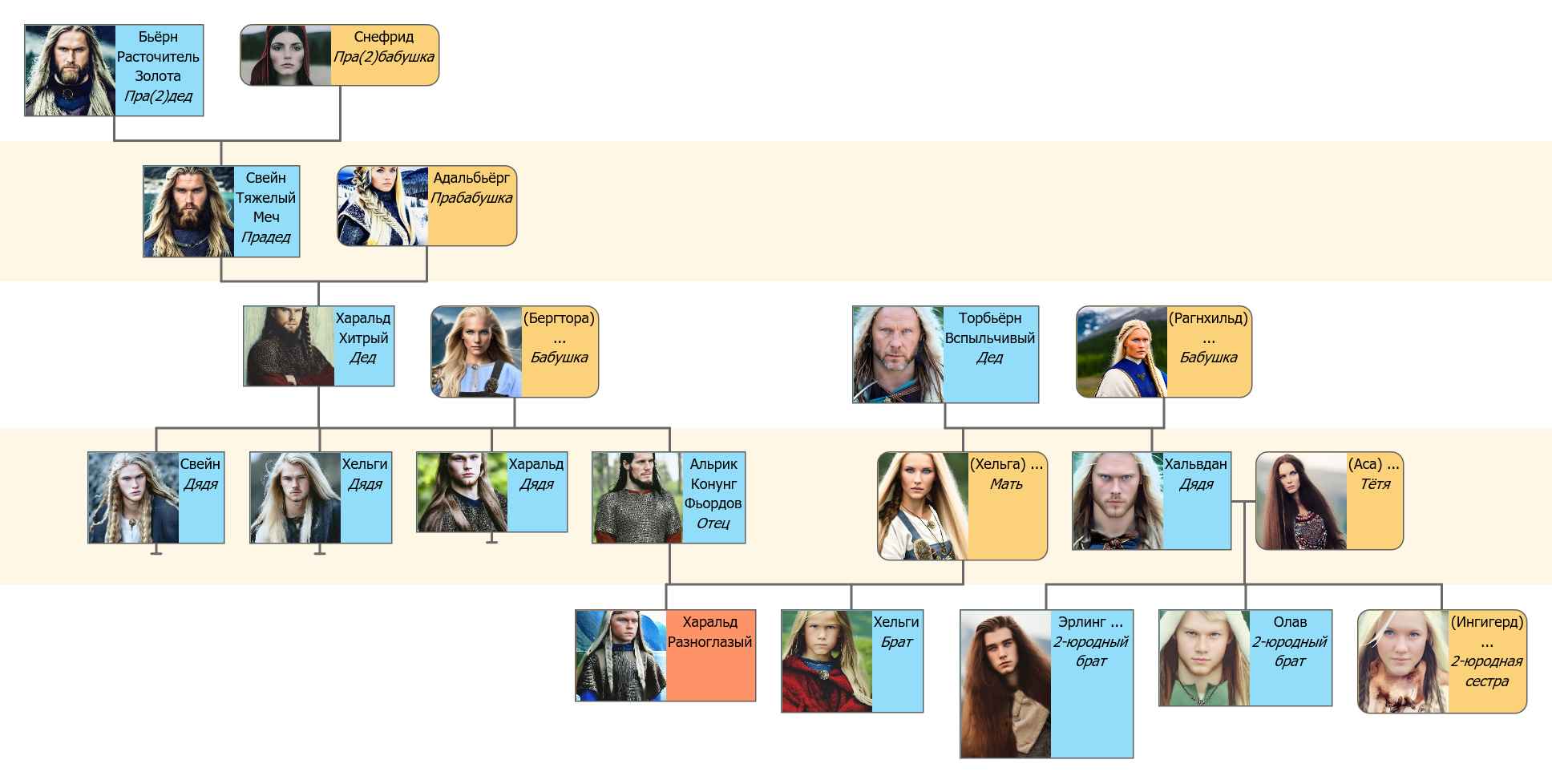 Это древо я делала в программе "Древо жизни 5". Она скачивается на компьютер, и уже оттуда можно в ней работать. Название степеней родства программа прописывает самостоятельно. И делает она это исходя из того, кого ставишь в качестве конечной точки рода. В моем случае конечная точка рода на данном этапе – Харальд Разноглазый. Он даже другим цветом подсвечен. Все мои герои относятся к знати. Почти все мужчины – конунги, кто-то из них носит звание херсира. Все женщины – дроттнинг, дочери ярлов или херсиров. А вы рисуете генеалогические деревья своих персонажей?