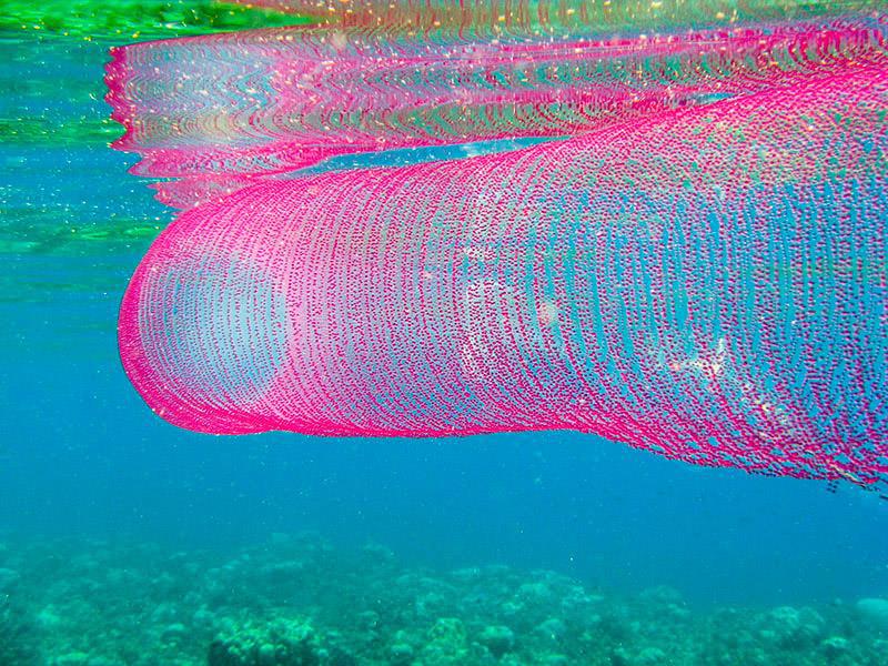 Огнетелки – крошечные существа вроде медуз, они сцепляются в гигантские цилиндры. Такая колония может вырастать до 30 м! Внутри огнетелок живут люминесцентные бактерии, поэтому прозрачные крохи светятся в ответ на раздражение. Если по трубе-тунике провести пальцем, останется сияющий след.