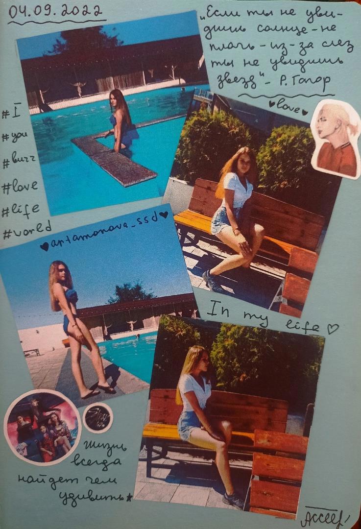 Из полученных фотографий я решила сделать фотоальбом с подписями и интересными рассказами о разных этапах наших жизней. Распечатав на принтере, я приклеила фото на цветную бумагу, затем и в сам блокнот, который решила для этого использовать. Вот что получилось из такой задумки: