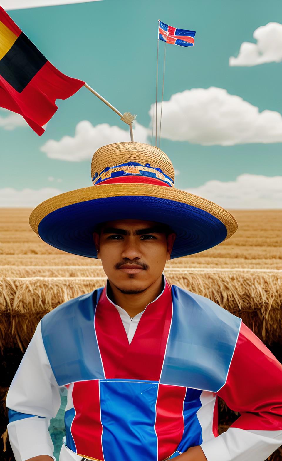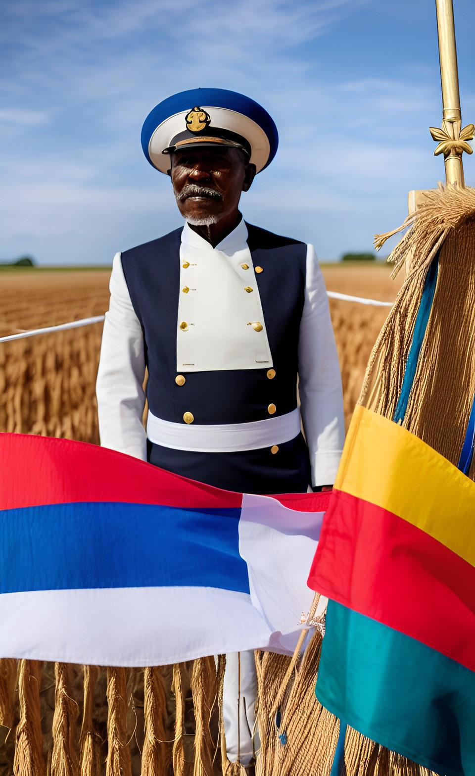 "El Almirante stands on the quarterdeck. He wears a hat with an ostrich feather. A blue flag with a golden sun flies above the stern, a white flag with a red Burgundy cross flag above the mizzen mast, blue sails"