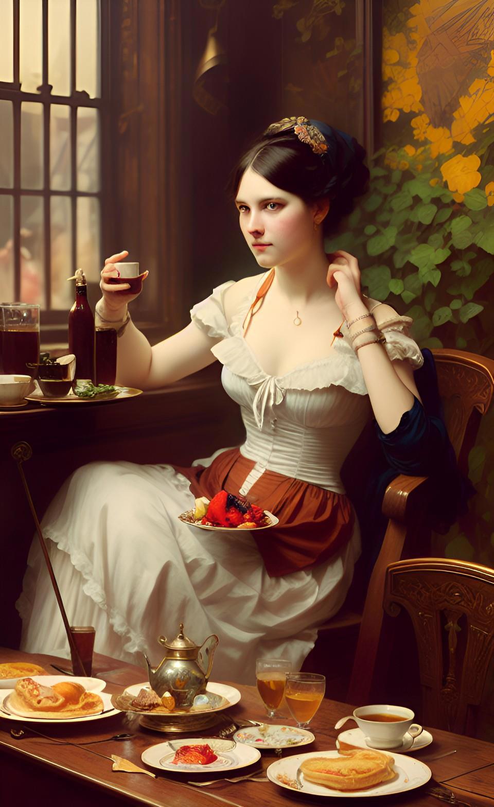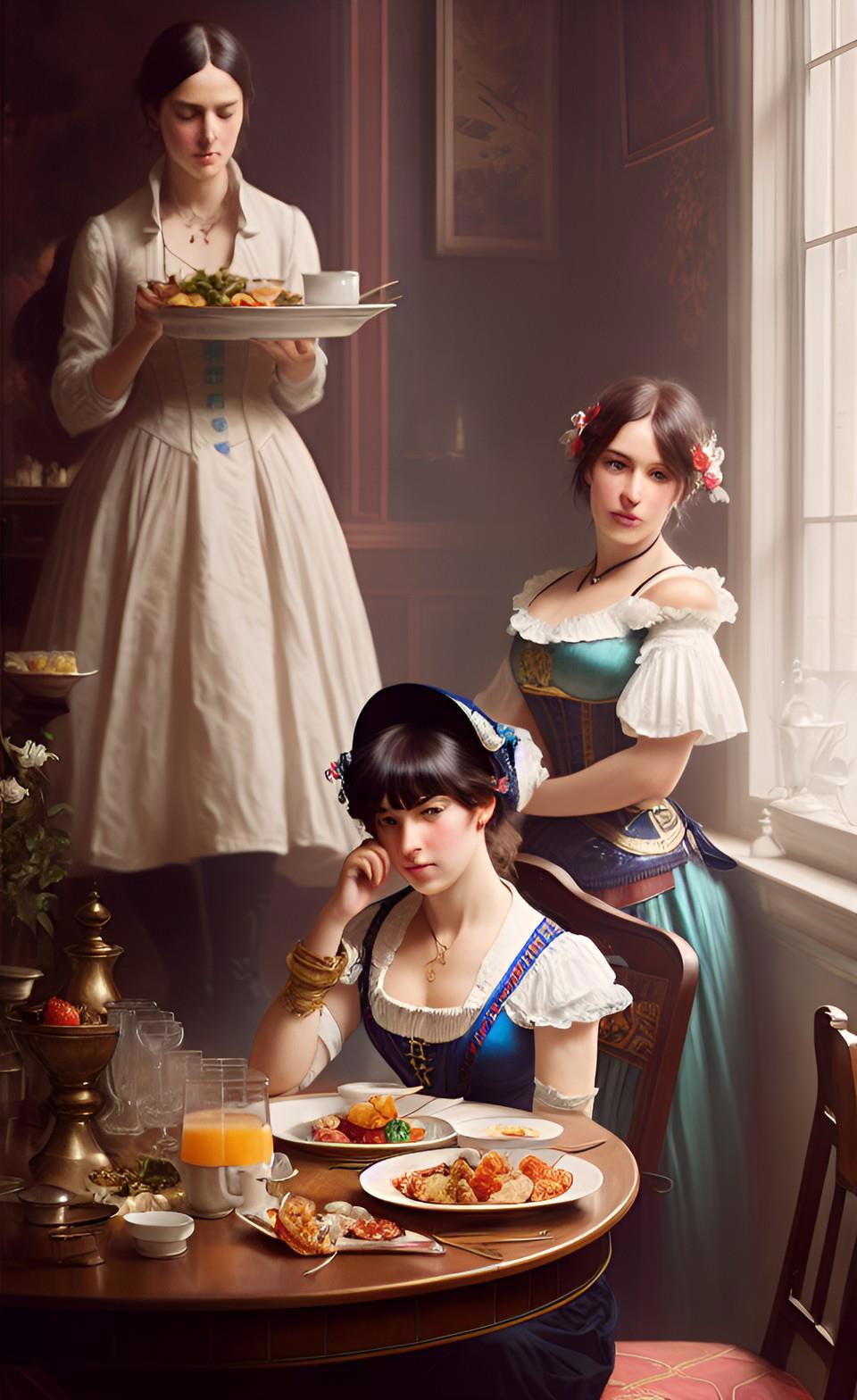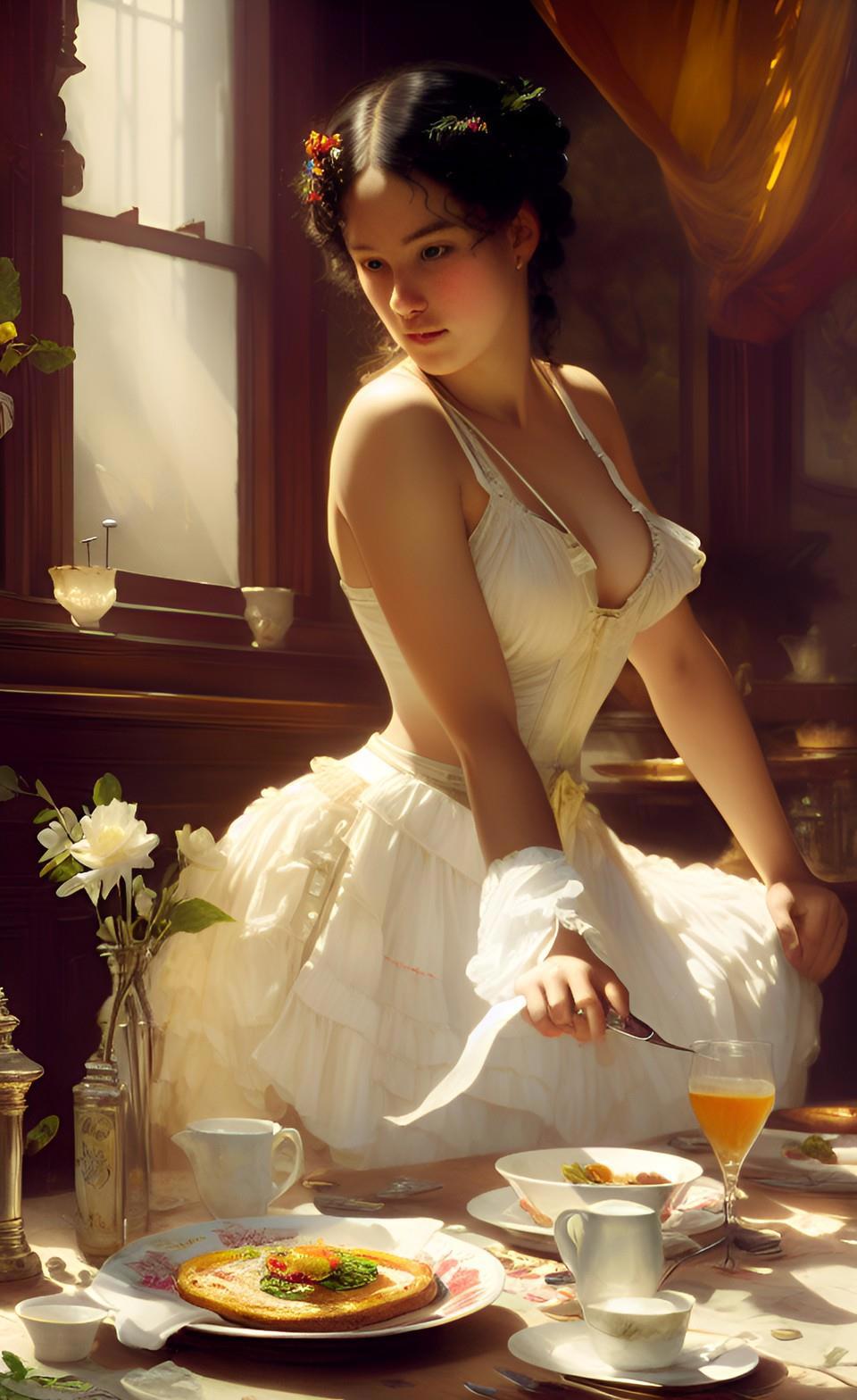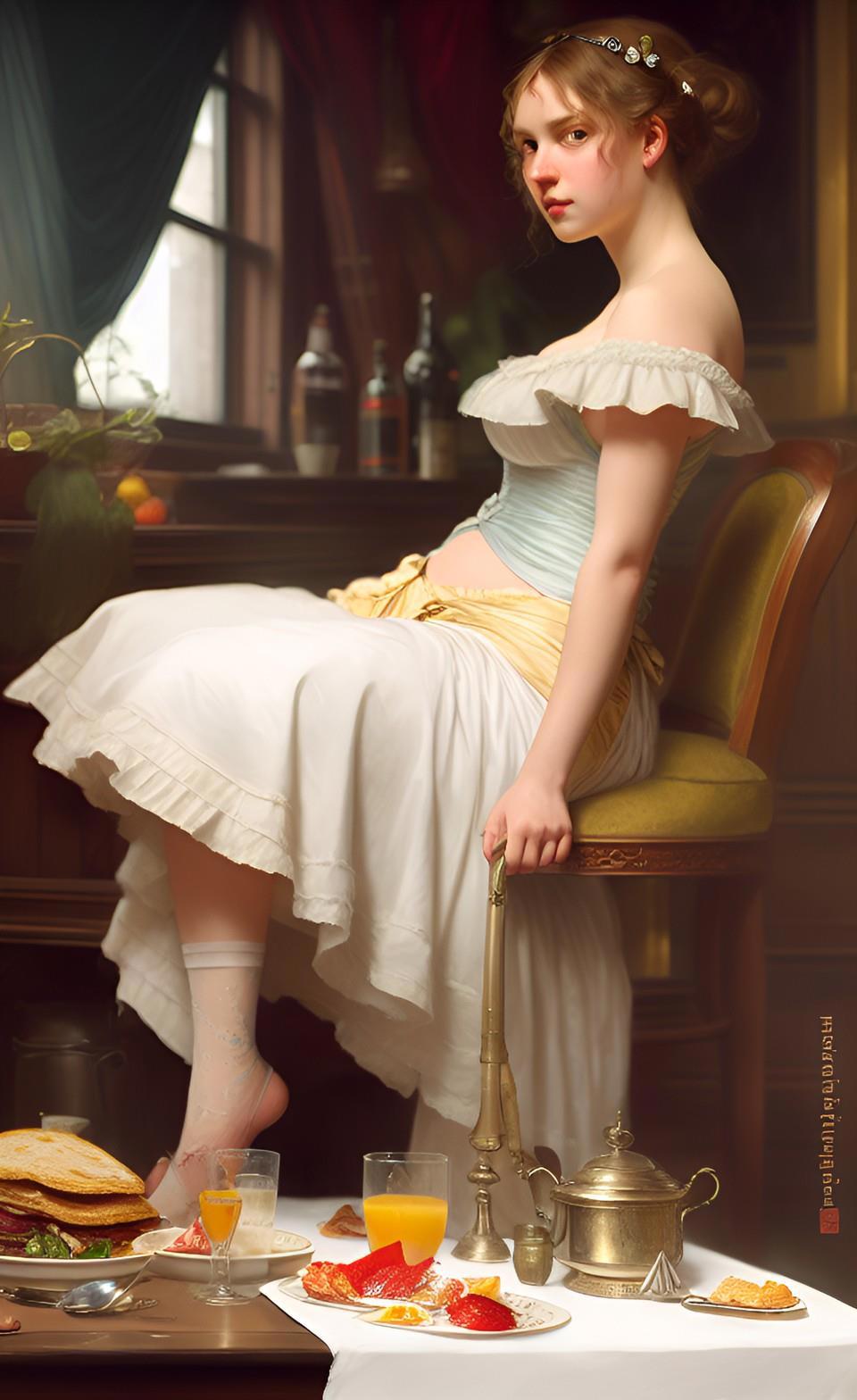 Собственно, именно воспоминания моего героя продиктовали мне запрос, который я ввел в мою любимую нейросеть WOMBO: "завтрак в борделе". А завтрак в борделе равносилен позднему ужину для всех остальных людей - это время отдыха от повседневных забот и отхода ко сну.