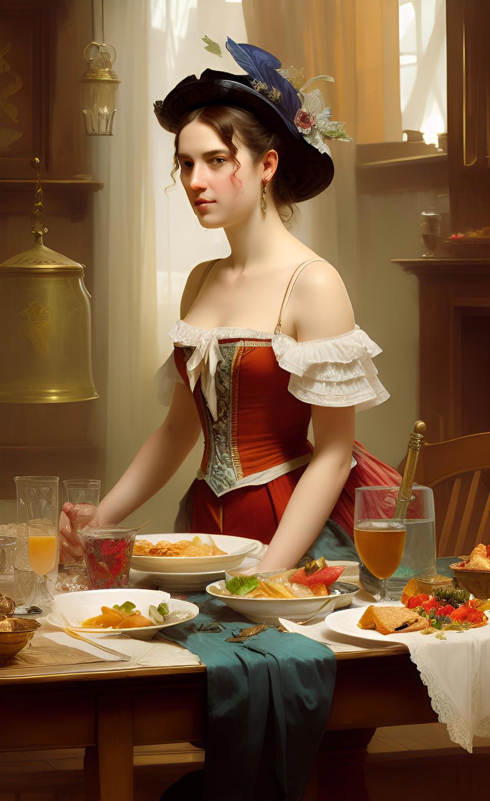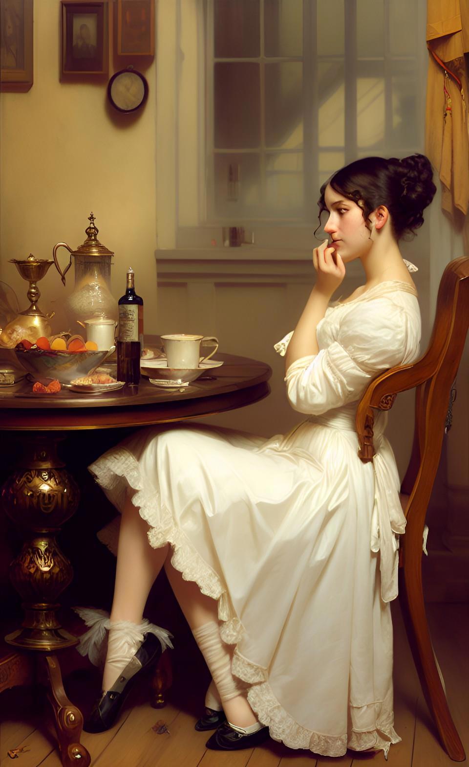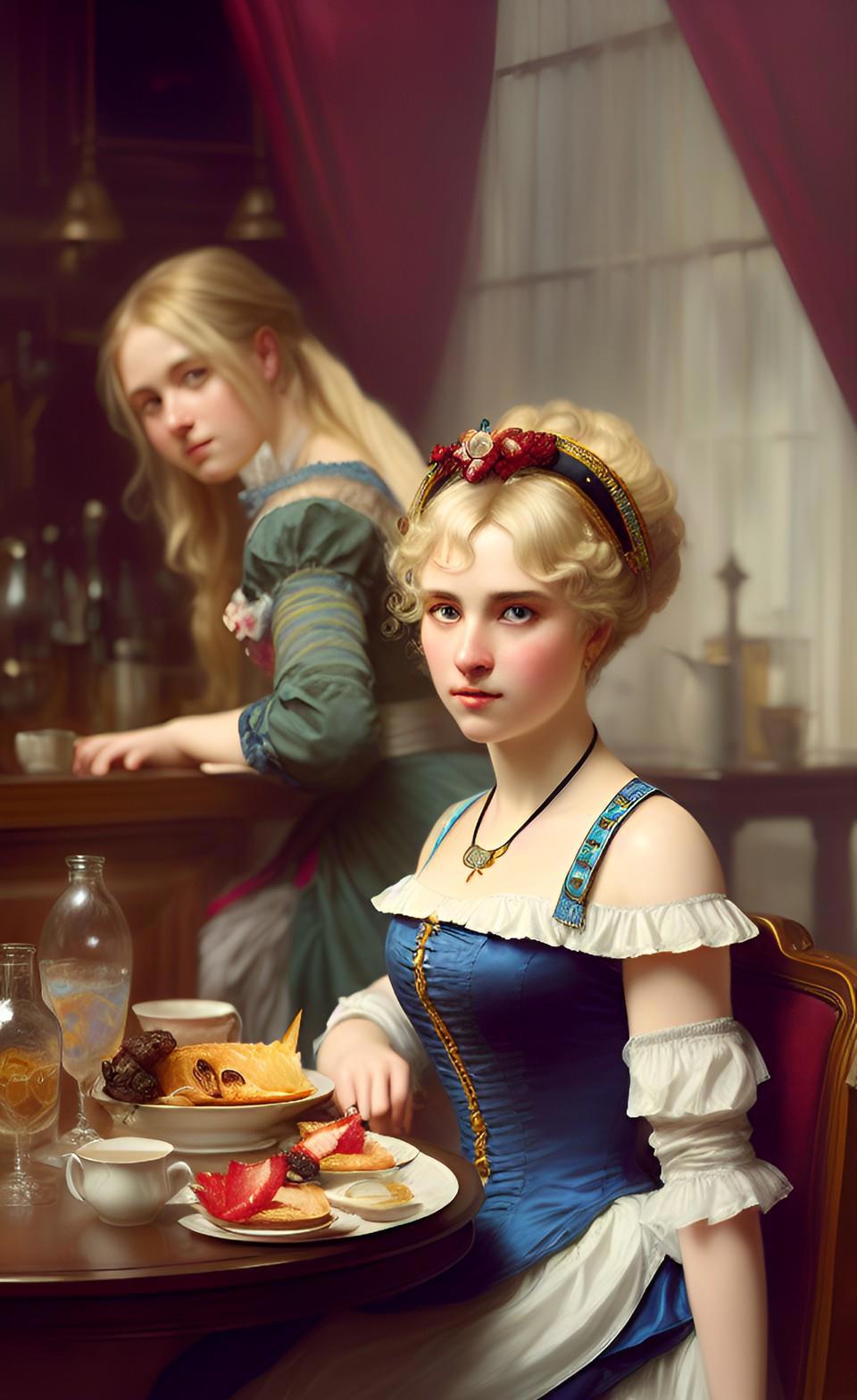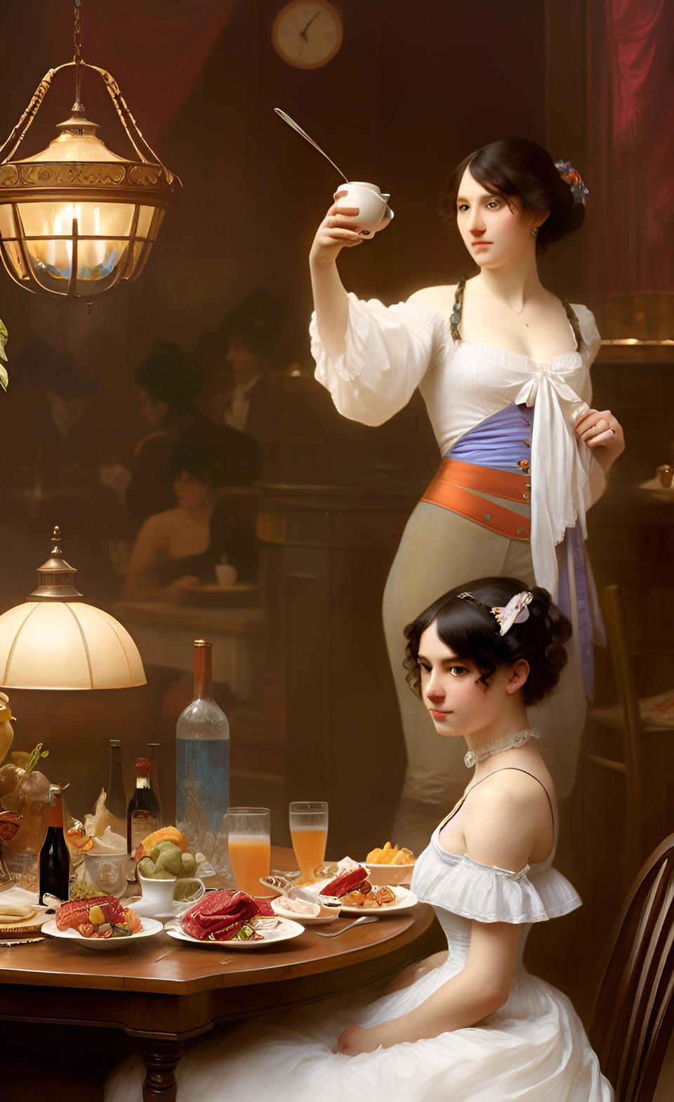 Собственно, именно воспоминания моего героя продиктовали мне запрос, который я ввел в мою любимую нейросеть WOMBO: "завтрак в борделе". А завтрак в борделе равносилен позднему ужину для всех остальных людей - это время отдыха от повседневных забот и отхода ко сну.