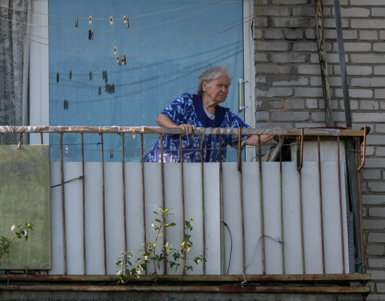 Типичный городской дворик, кирпичные пятиэтажки, вокруг них трава, кусты и деревья. На балконе 4 этажа стоит бабка и сердито смотрит вниз. Внизу, под балконом, согнувшись в три погибели бродит дед. Он заглядывает под каждый куст, шарит в высокой траве, иногда переводит взгляд на деревья и на стоящую на балконе бабку. Бабка сверху руководит тоном, который не обещает деду ничего хорошего: