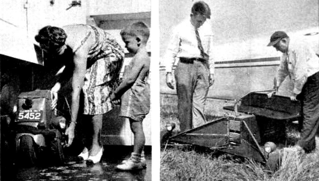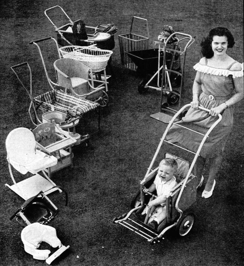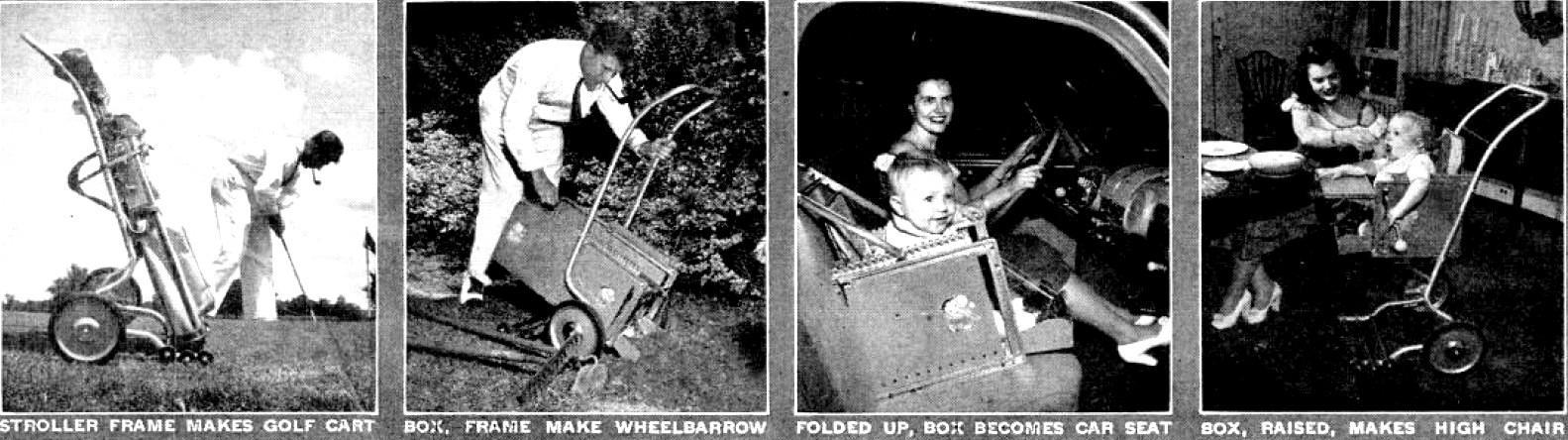 Описанное выше приспособление — это детская коляска, но это также гораздо больше. По сути, это своего рода механизм-всей-работы. Построенный Роджером Лауфером из Луисвилля, штат Кентукки. Он предназначен для замены не менее 10 отдельных единиц оборудования, с помощью которого среднестатистическая американская мать кормит, обслуживает и ограничивает свободу своих маленьких детей. Манипулируя рядом гаек и болтов и переставляя три основные части, коляску можно превратить в сиденье для унитаза, автокресло, стульчик для кормления, люльку, детскую коляску или миниатюрные качели. Кроме того, у неё есть колеса с коленным приводом и надежные тормоза. В течение нескольких минут дня, когда ребенок занят в другом месте, отец может быстро переоборудовать его для использования в качестве тачки, багажной тележки, продуктового фургона или тележки с сумками для гольфа на колесиках.