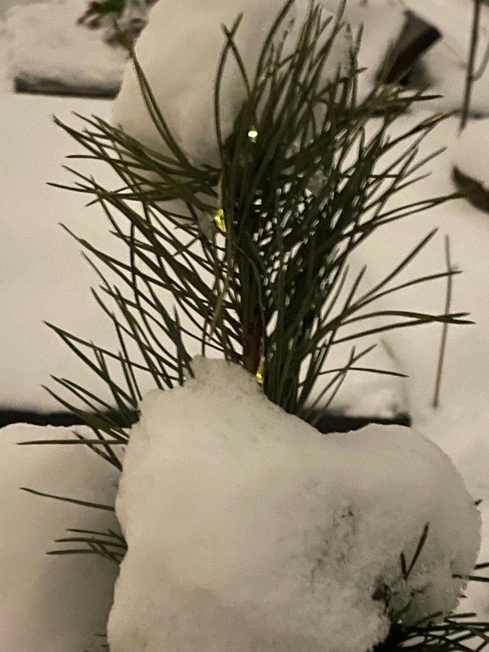 Автор: 01Гирлянду на елочке включили вечером 31 декабря 2022, чтобы посветилась в новогоднюю ночь. Две пальчиковые батарейки дюрасел в пластиковом контейнере были завернуты в целлофановый пакет и спрятаны поглубже под ветки от снега и дождя.