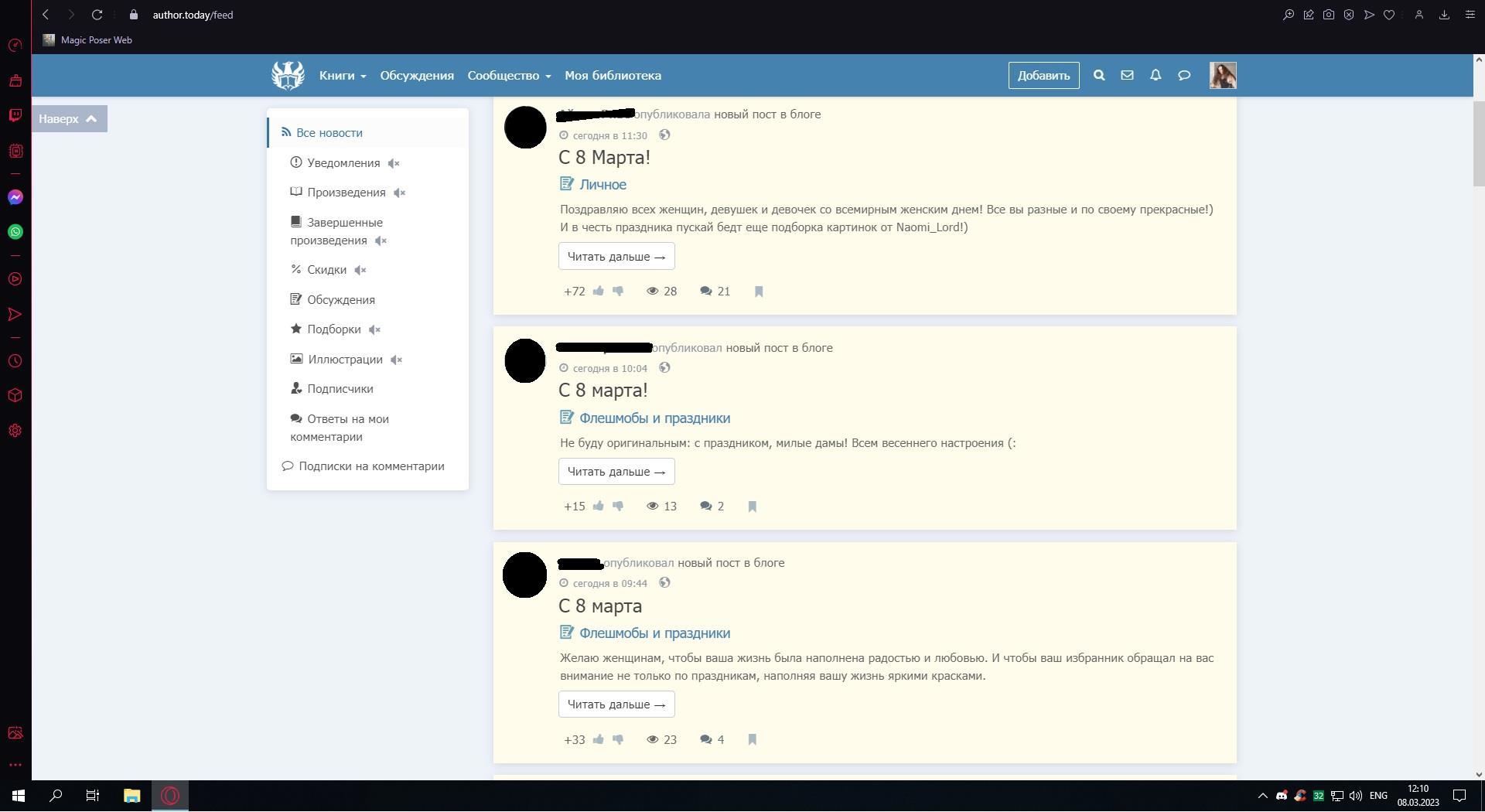 Мы живём в будущем - что, правда всё ещё хватает людей, которые такие "Вау! Мой любимый автор поздравил меня с тем или иным праздником! Какой он крутой!!!" (а как пишешь такому автору, что героя\героиня его книг прописана как фанера - получаешь ЧС, хехе))). И конечно же масса восторженных носителей сублимированного добра тут же подключается со своими "Да-а, всех с восьмым марта! Всех-всех с восьмым марта!"...