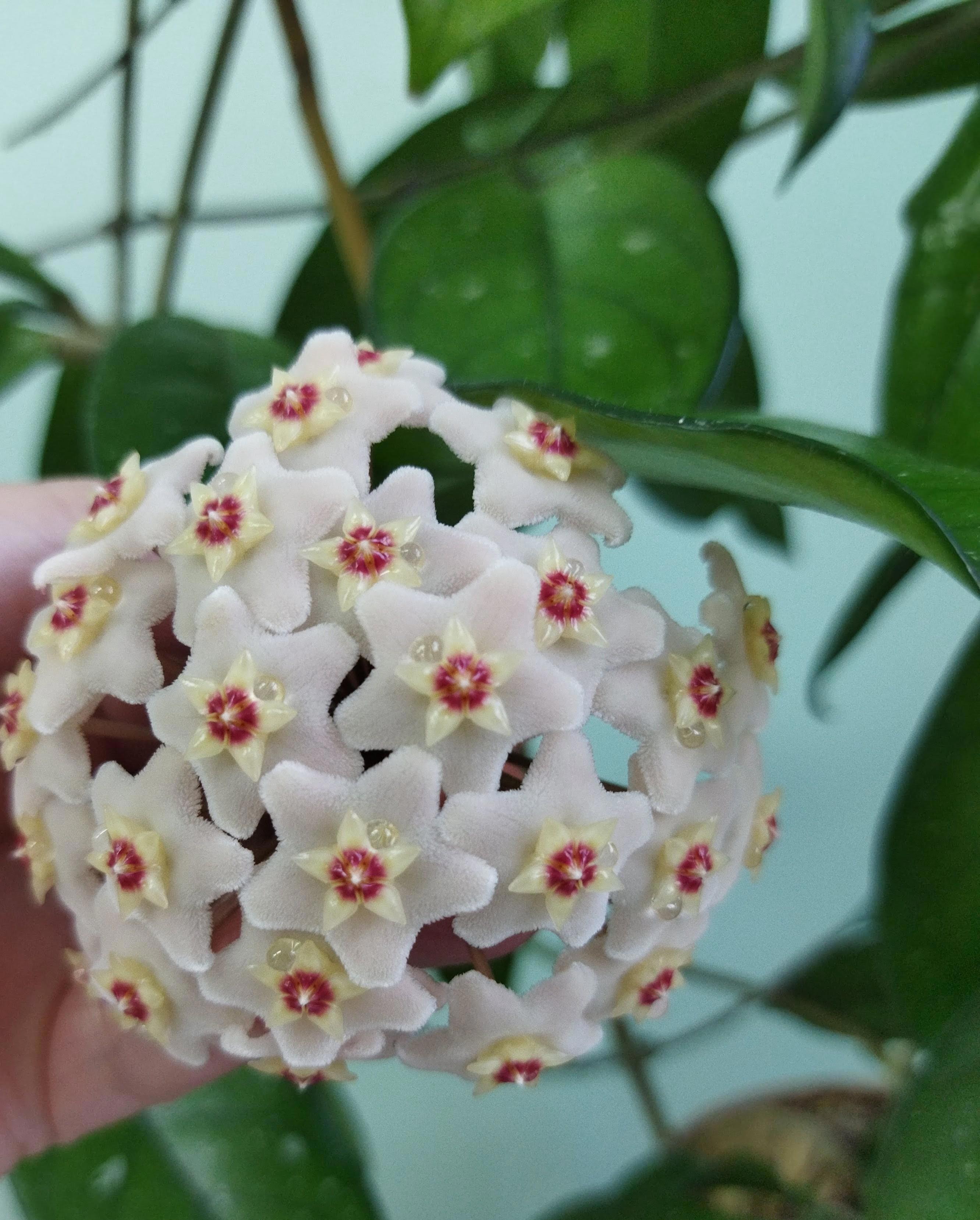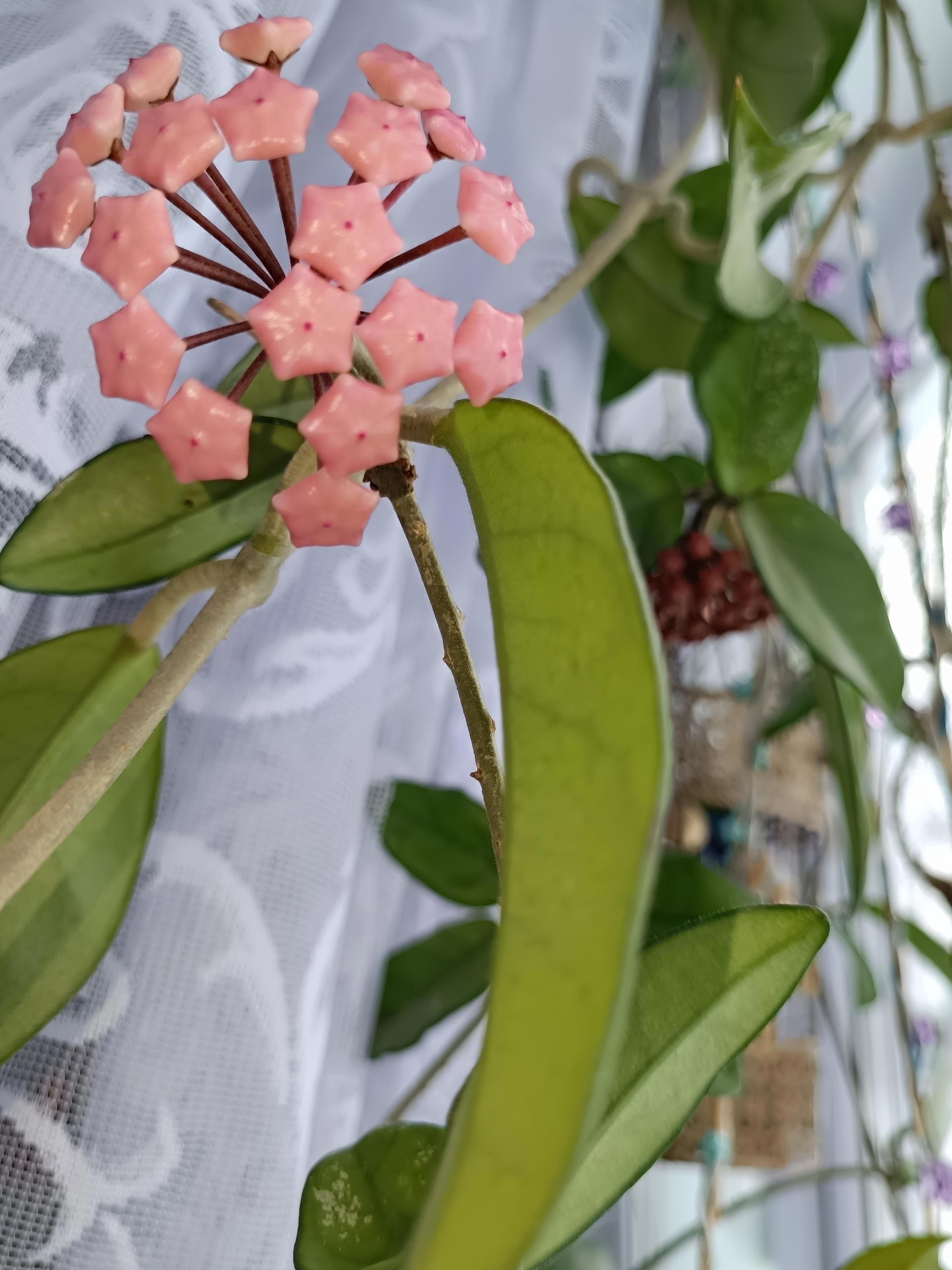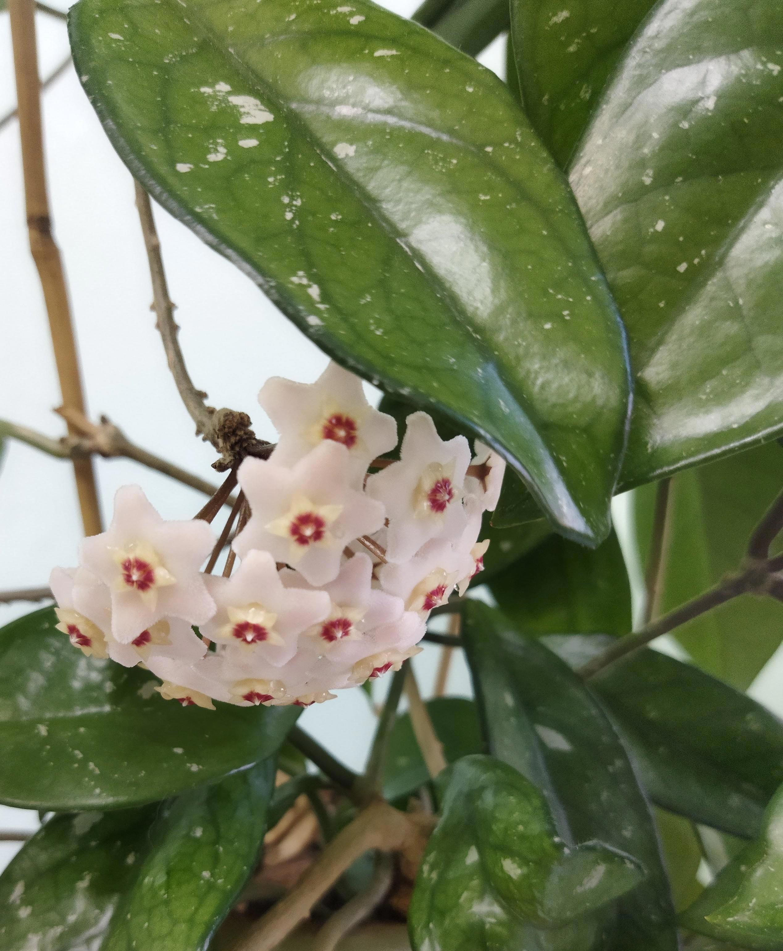 И ещё хойя (восковой плющ), которую мне сплавили, как "совершенно неспособную цвести", снова зацветает после непродолжительного перерыва. Опять я не успела её пересадить. Пока что она выглядит вот так, будто и вправду облили розовым воском)