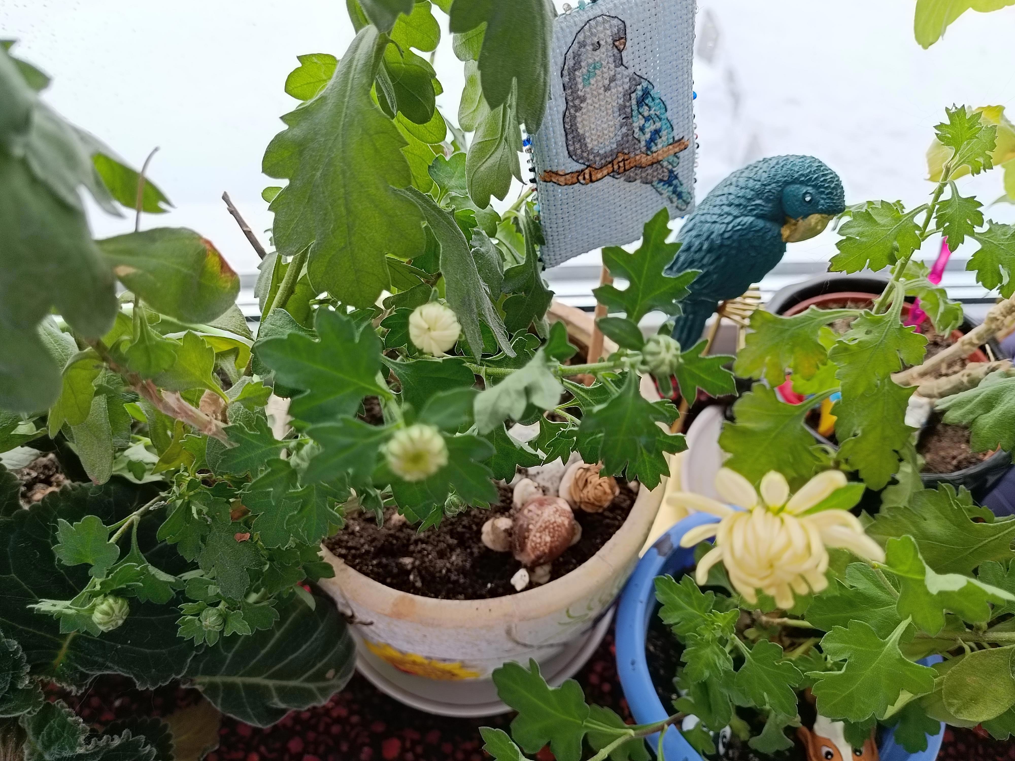 А у меня хризантемы (которые пустили корешки в вазе и были посажены в декабре) понабрали бутонов)) причём, в букете они были белые, а распускаются светло-жёлтенькие))
