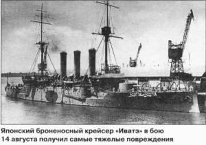 1. участие в крейсерском бою 1 (14) августа 1904 года с Владивостокским отрядом крейсеров ("Россия", "Громобой и "Рюрик", последний в этом бою героически погиб, окружённый и расстрелянный превосходящим противником). В ходе этого боя "Ивате" получил более 10 попаданий (40 убитых, 47 раненых), сильные повреждения и находился в ремонте до 6 (19) августа.