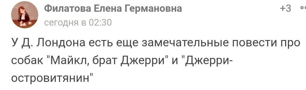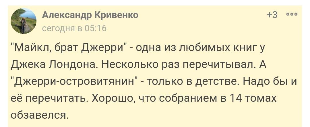 … приключения собаки — героя моего романа — являются подлинными приключениями.. Когда я с женой отплыл на «Миноте», мы нашли на борту очаровательного щенка, охотника за неграми; то была такая же гладкошёрстная собака, как и Джерри, а звали её Пеги… Миссис Лондон и я так к ней привязались, что миссис Лондон после крушения «Миноты» сознательно и бесстыдно украла её у шкипера «Миноты»….Мне остаётся прибавить, что Пеги, как и Джерри, родилась у лагуны Мериндж на плантации Мериндж, находящейся на острове Изабелла .