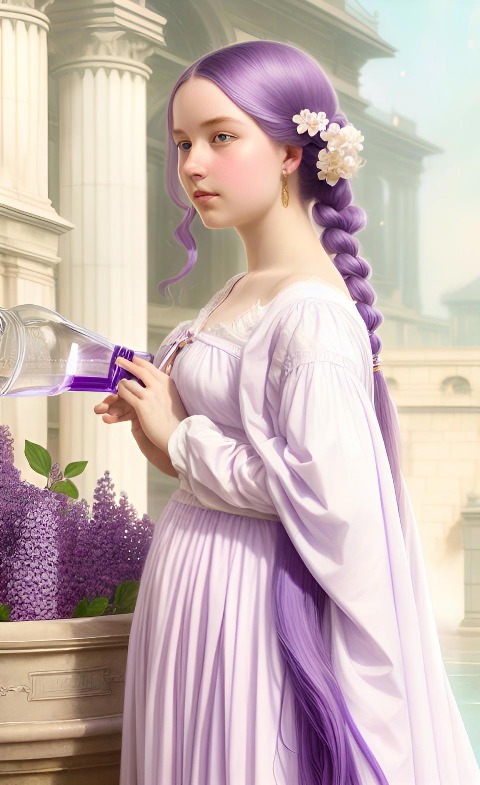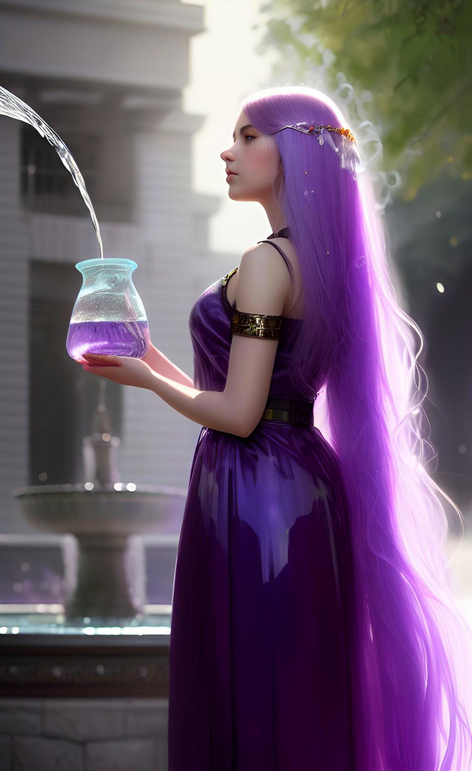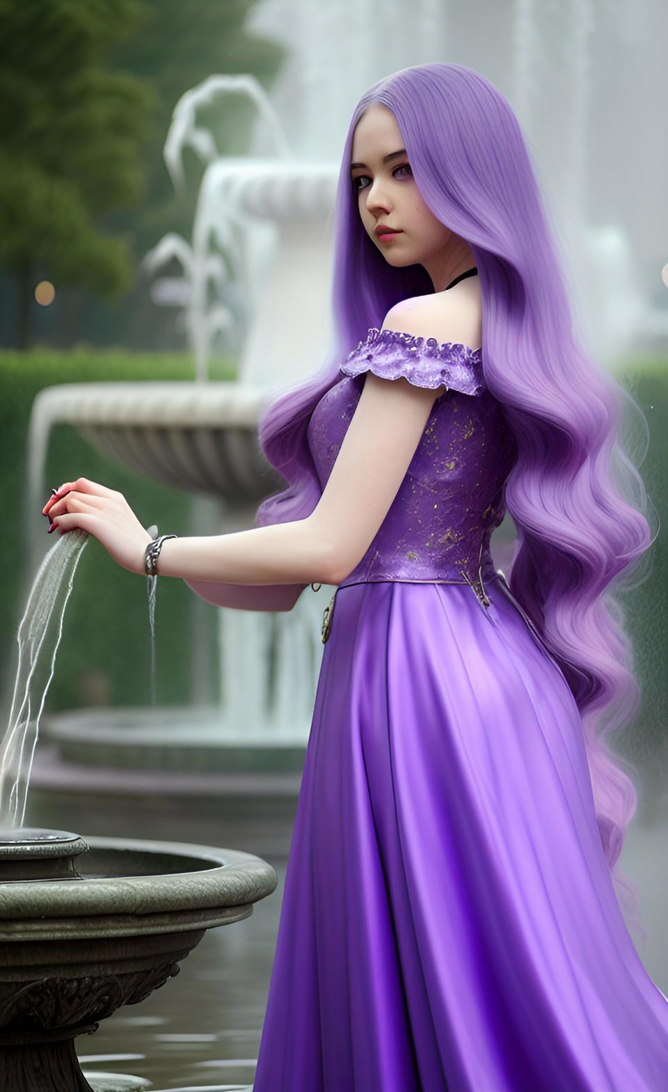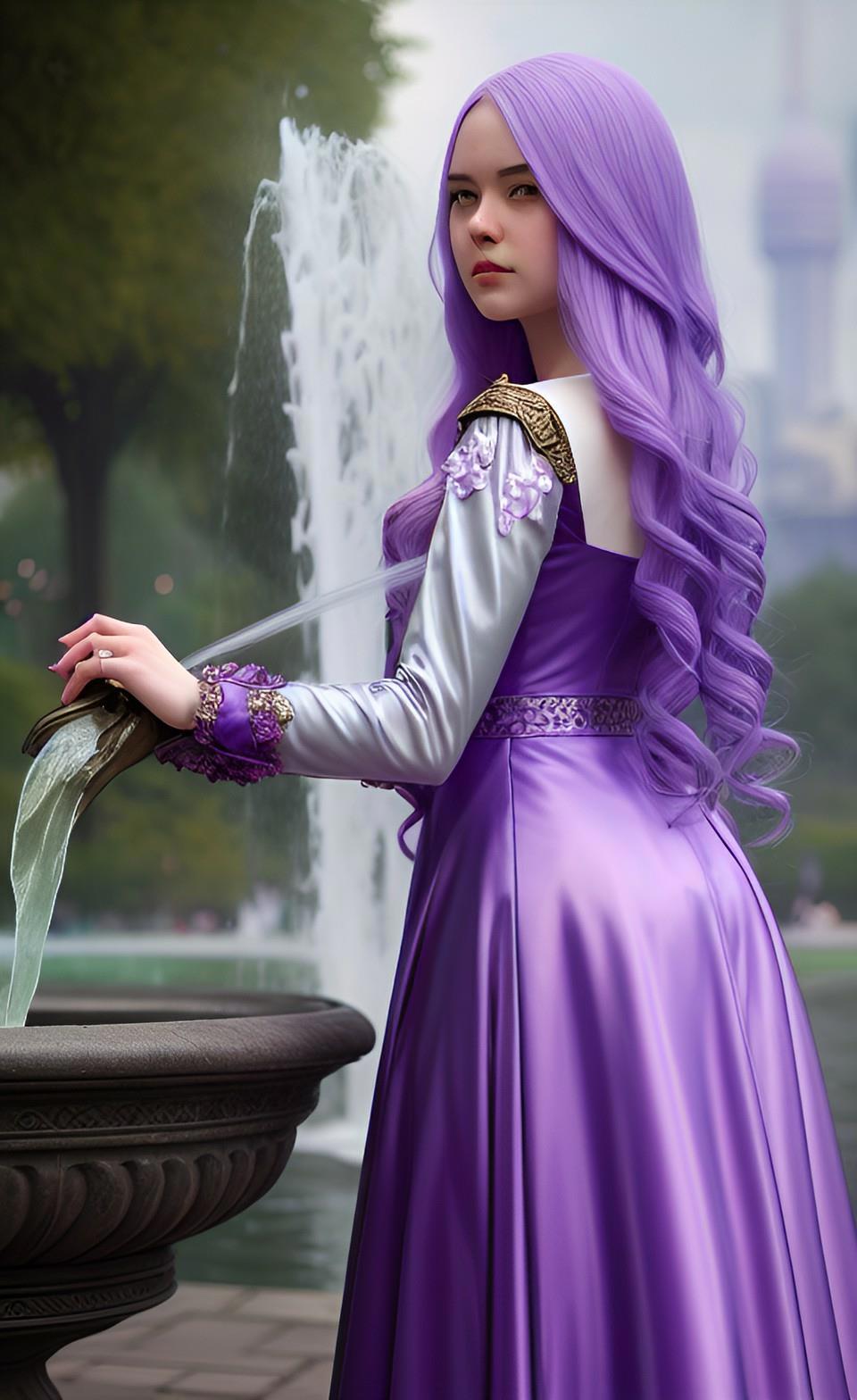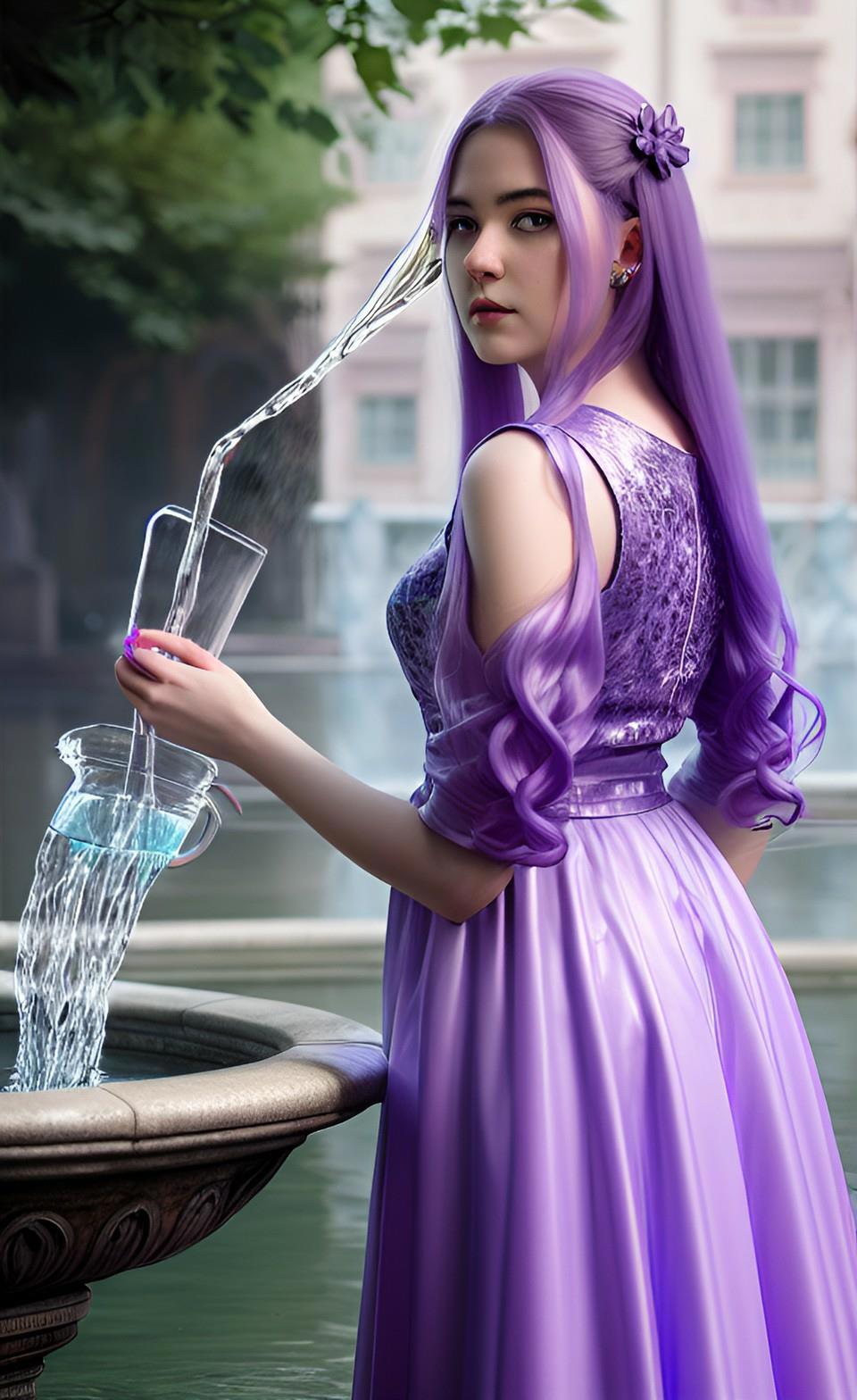 Спокойствие. В саду у фонтана юная девушка набирает воду в кувшин и снова выливает ее. Небо прозрачное. Лицо девушки светлое, почти прозрачное. Вокруг лица обмотаны пышные волосы. Фиолетовые. Светло-фиолетовые с золотисто-коричневатым отливом.