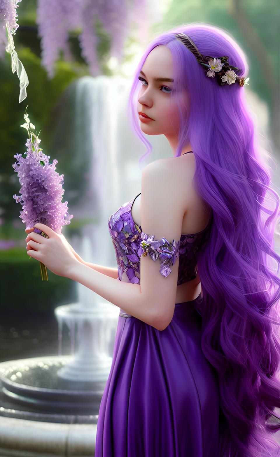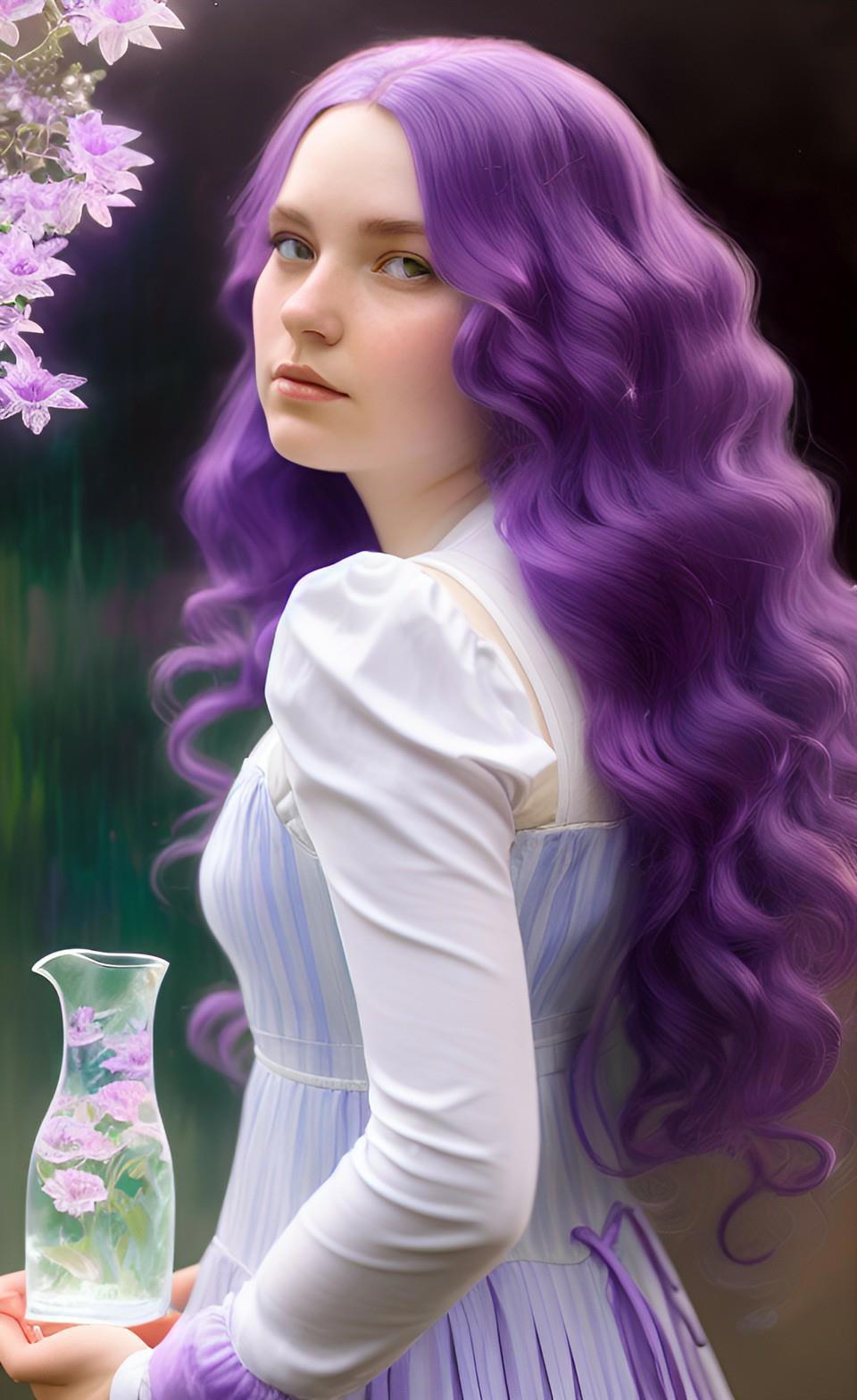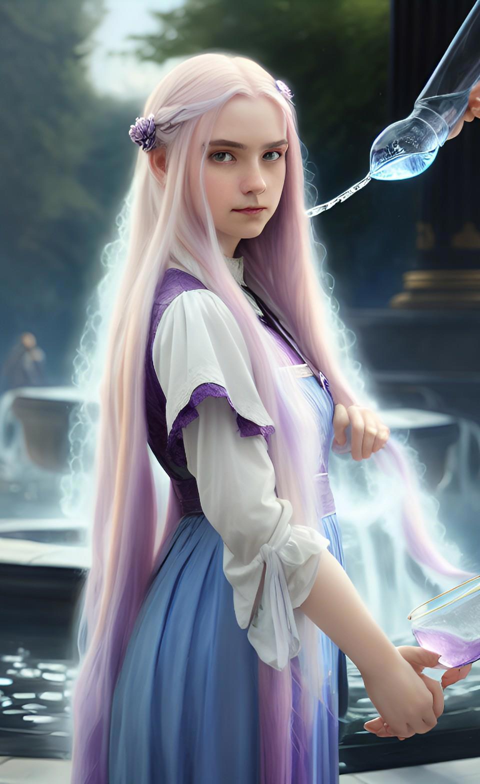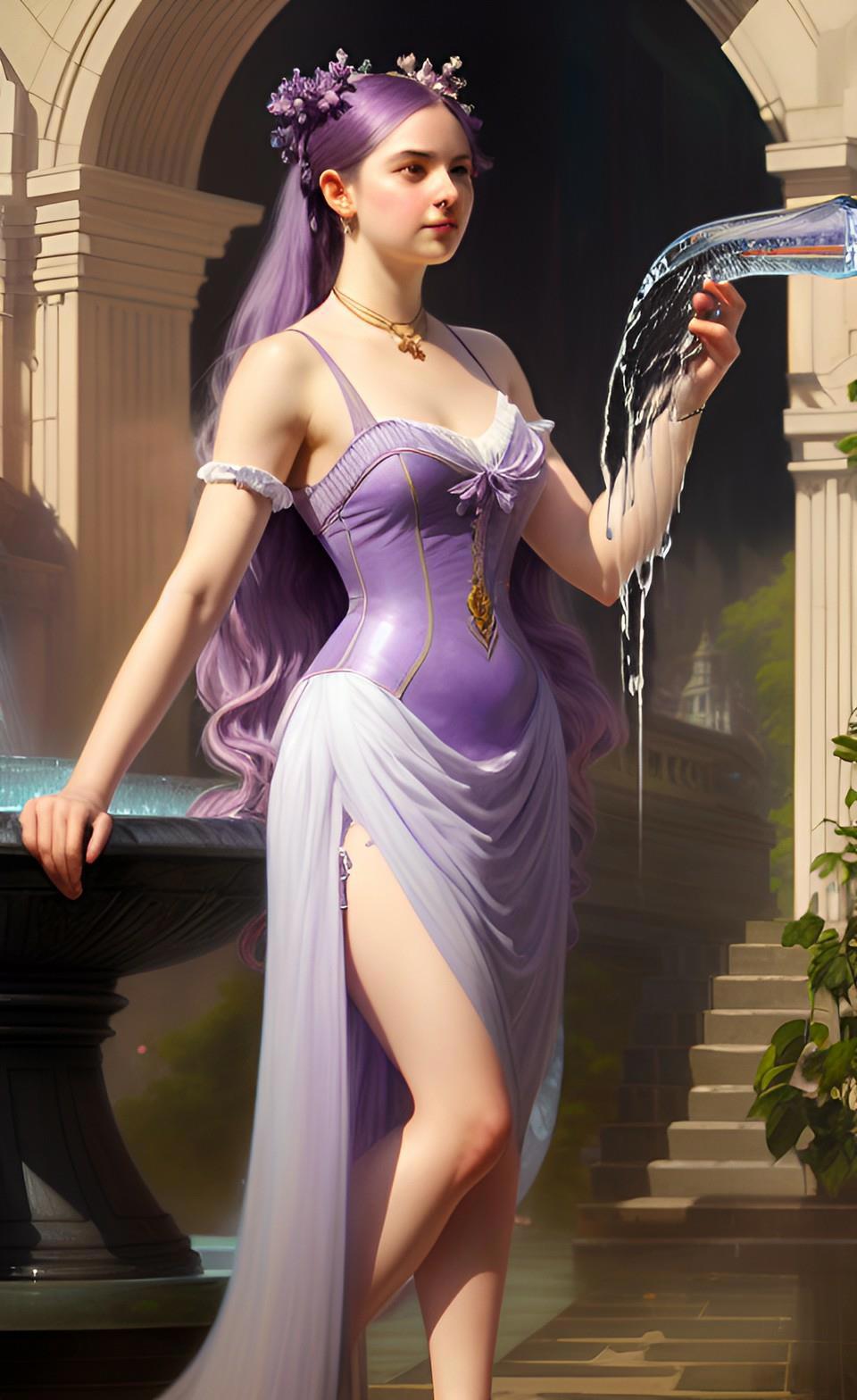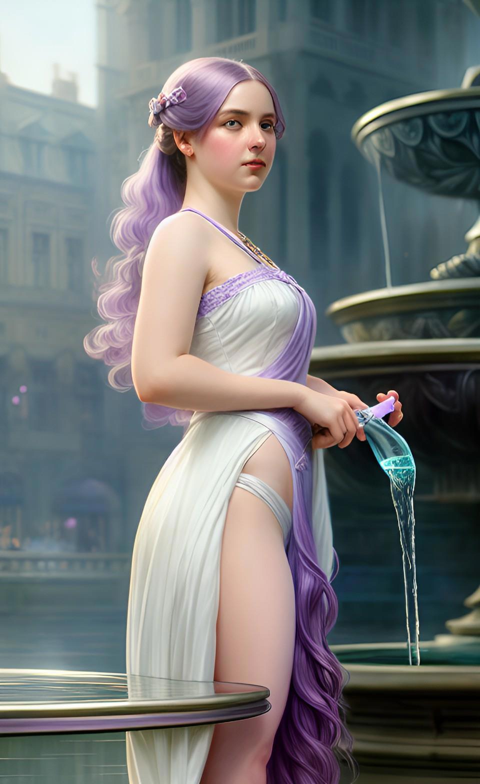 Спокойствие. В саду у фонтана юная девушка набирает воду в кувшин и снова выливает ее. Небо прозрачное. Лицо девушки светлое, почти прозрачное. Вокруг лица обмотаны пышные волосы. Фиолетовые. Светло-фиолетовые с золотисто-коричневатым отливом.