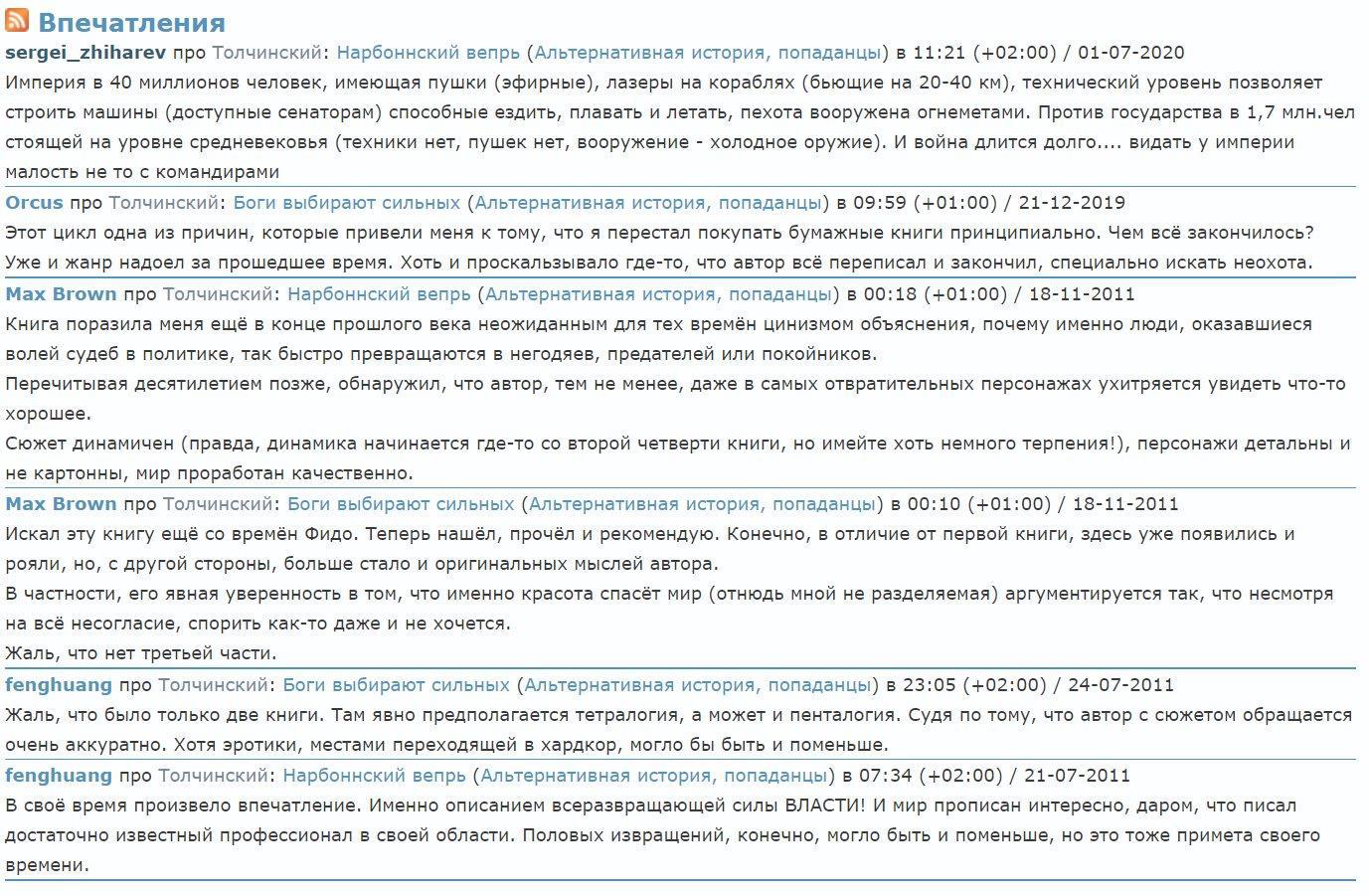 Как видите, первые отзывы - это ещё 2011 год. Max Brown - тот самый фидошник, наш человек, который, прочитав первую книгу цикла, буквально перевернул весь Обнинск в поисках второй; издательство, "от большого ума" и нежелания прислушиваться к автору, разделило неразрывные части единого целого, и вторую книгу было не найти - а потом, когда она вышла, не найти было первую (её расхватали), в итоге проиграли все. Коллега Алексей Волынец и другие мои давние читатели неоднократно рассказывали, что сначала прочли "Боги выбирают сильных" и лишь потом - "Нарбоннского вепря", когда добрались до него. Но все четыре отзыва, от Fenghuang и Max Brown, составят честь любому автору, и для меня они важны. Это отзывы от людей, которые приложили усилия, чтобы найти мои книги, а когда нашли, то знали, что читают и зачем.