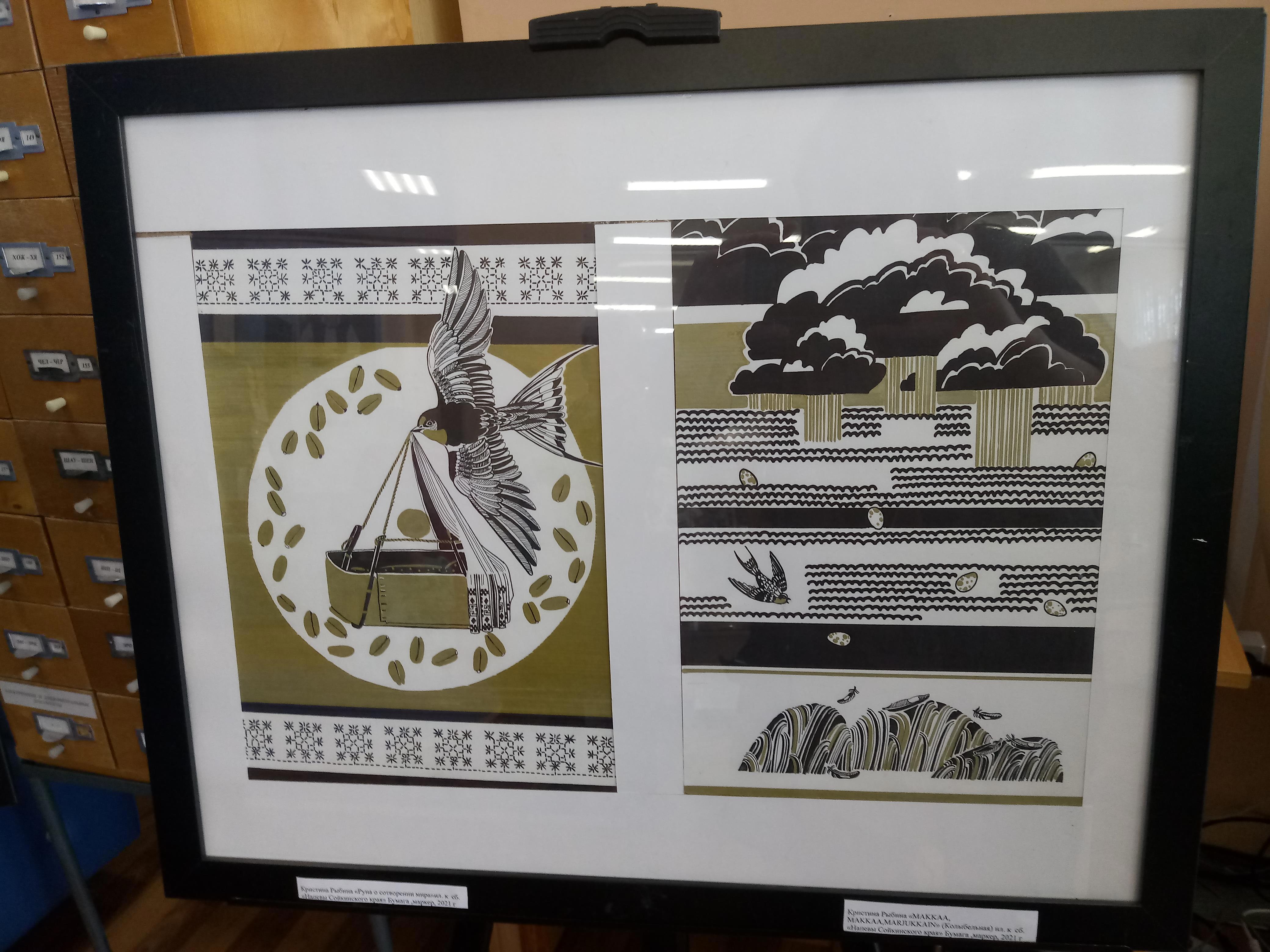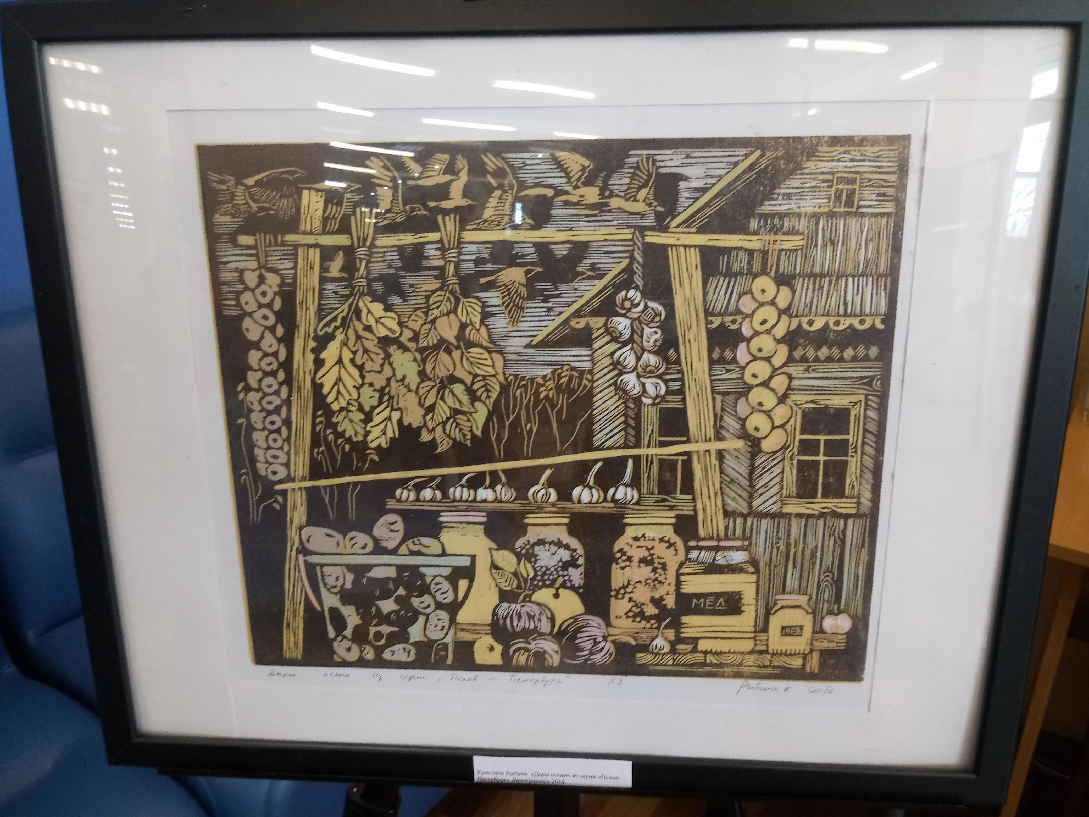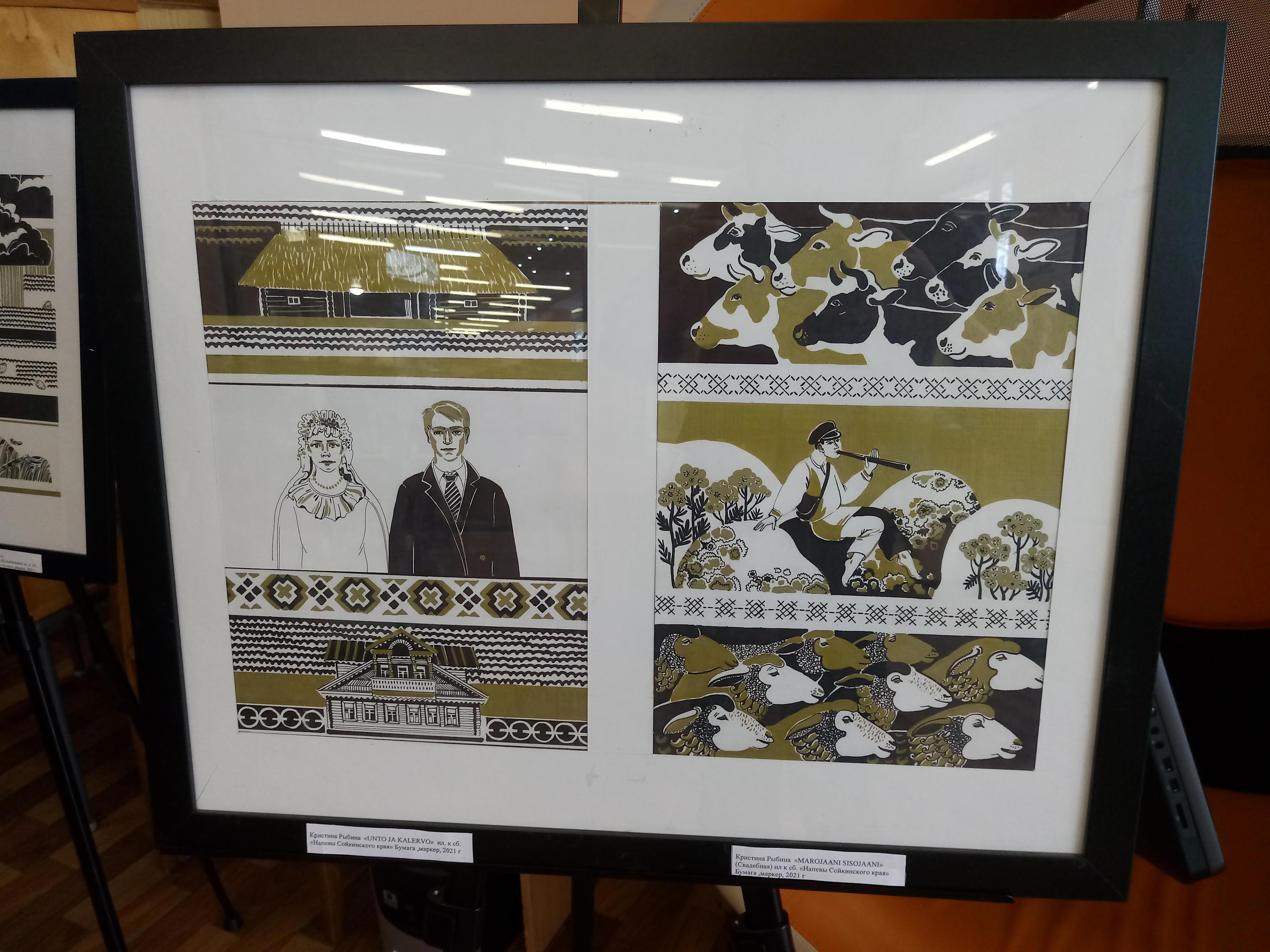 В связи с недавним Женским днем, выставку озаглавили "В гостях у финно-угорских хозяек". Здесь представлена серия цветных линогравюр, изображающих сцены финского быта и эпических сказаний.