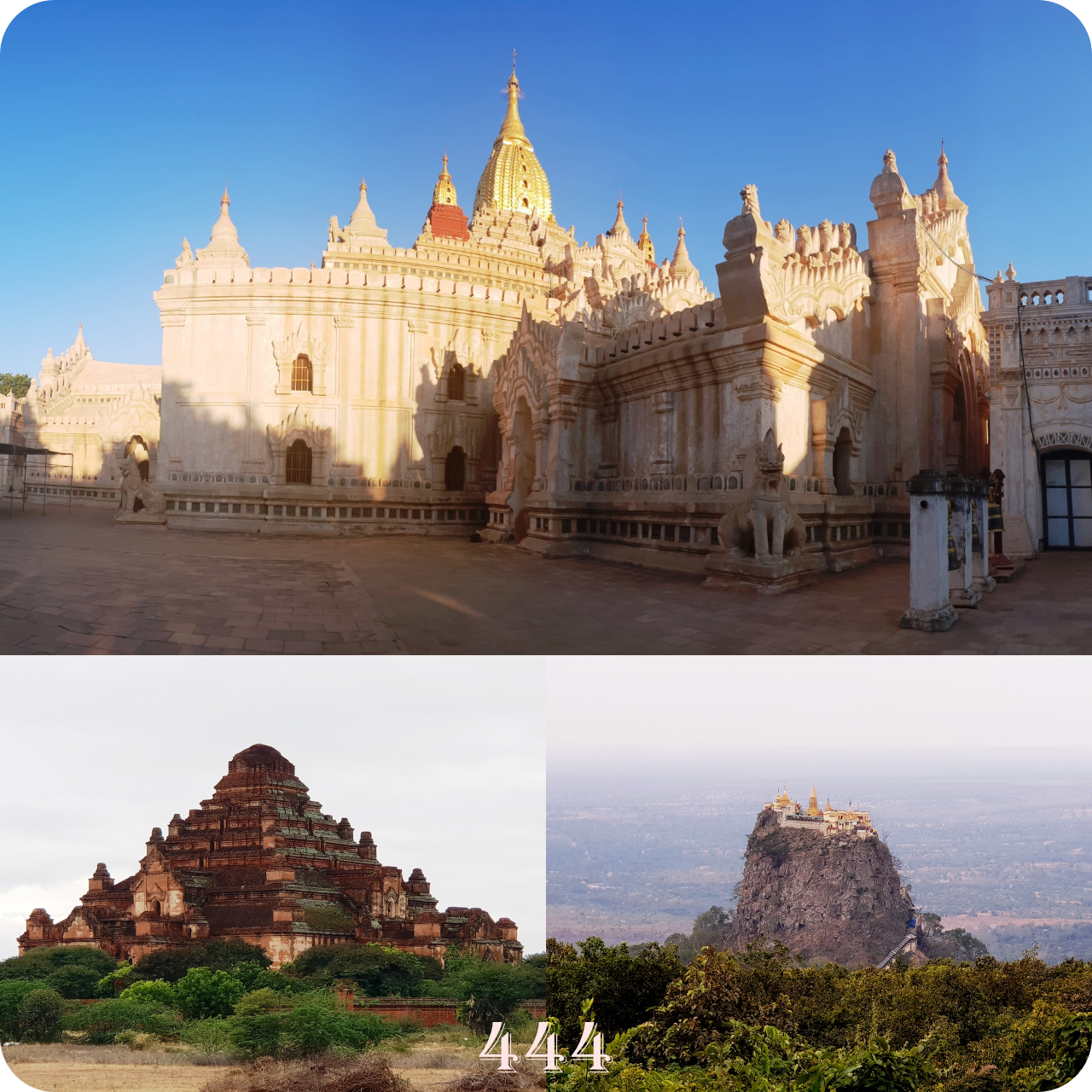 4. Баган (Паган). Археологический комплекс в сердце Мьянмы на месте ее древней столицы, занимающий около 100 кв.км, на которых расположены тысячи ступ и храмов. Большинство из них относятся к XI-XIII векам и находятся в плачевном состоянии. Объект ЮНЕСКО. В относительно короткой поездке от Багана Таунг-Калат (Гора Поупа). Расположенный на 225-метровой скале буддистский монастырь со стороны очень хорош, хотя внутри впечатляет не слишком.