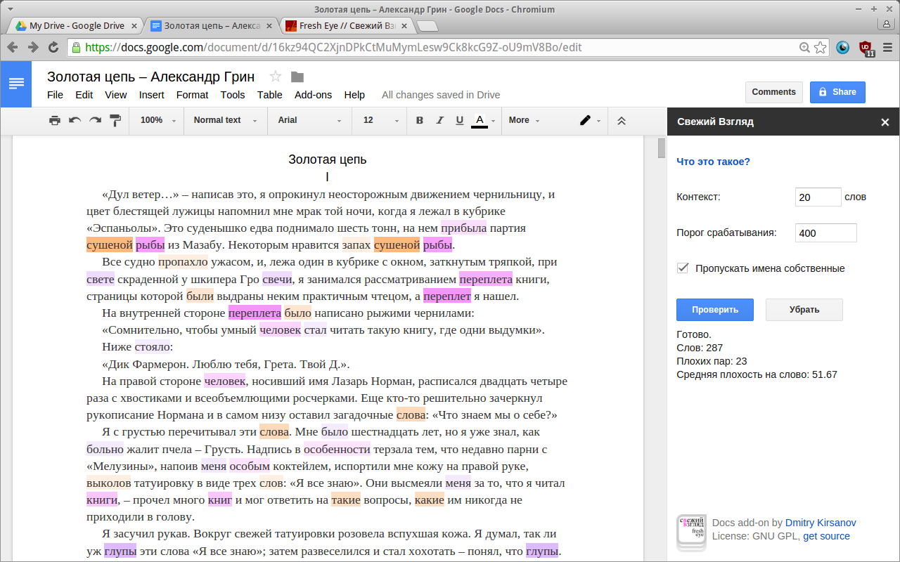 Автор: Денисова Саша2019 год. Технологии всё увереннее прибывают в нашу жизнь. В стороне не осталась и работа писателя. Ему на помощь приходят нейронные сети! Но мощностей обычного домашнего компьютера пока что не хватает чтобы стабильно с ними работать. Другое дело гиганты IT-индустрии. Например Google. У того есть несколько инструментов для обработки текстов, но в закрытом виде. Чтобы чуть приоткрыть мощь сервером гугл и сделать наши книги немного лучше, создан бесплатный add-on для Google Docs в браузере Chrome. С помощью этого приложения вы сможете легко определять паронимы, тавтологии или случайные задвоения. Вот как это работает: