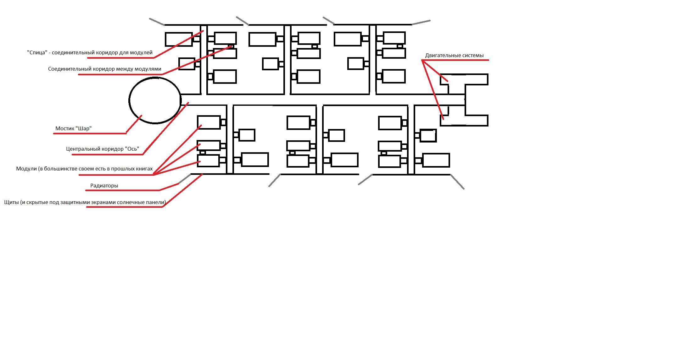 Вот ее упрощенная схема (на деле корабль намного длиннее и "спиц" на нем в разы больше, как и модулей. ну а кому мало такого изображения, то я еще слепил простенькую 3D модель для наглядности.