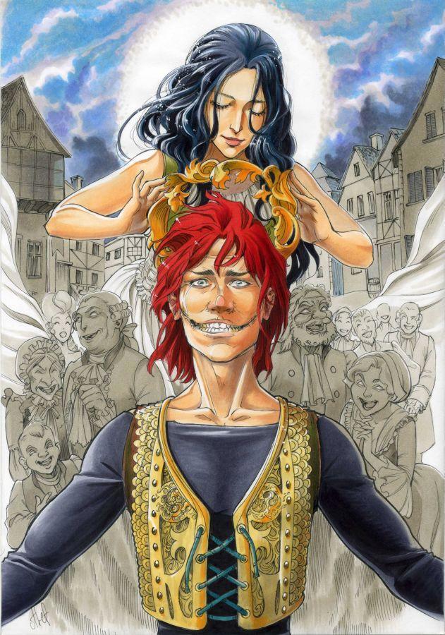 Он не может согнать с лица застывшую на нем улыбку, в результате чего вынужден бродить по городам и весям в компании приемного отца и непорочной девы, разыгрывая для простонародья балаганные представления.