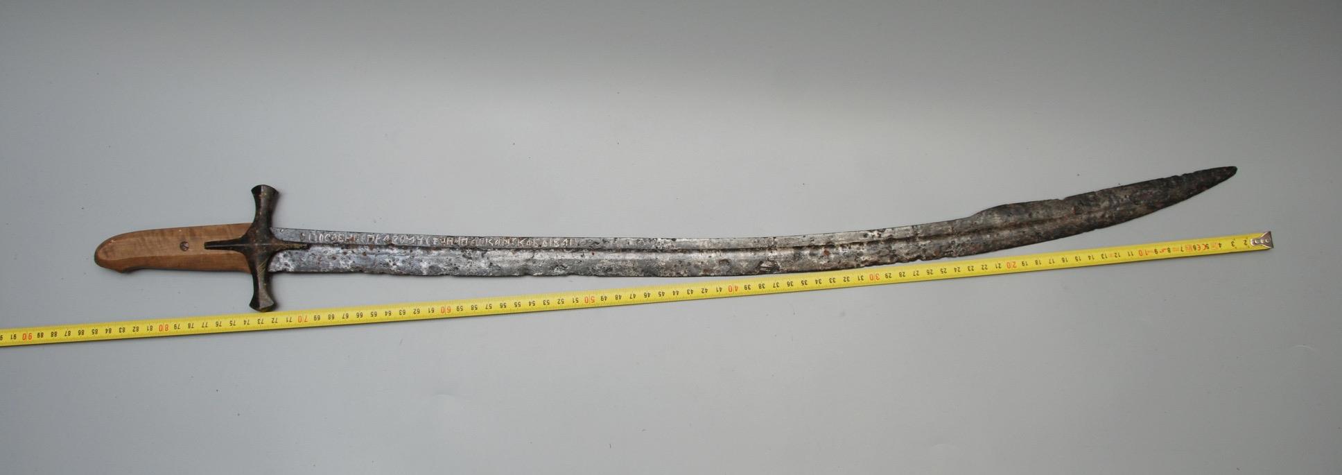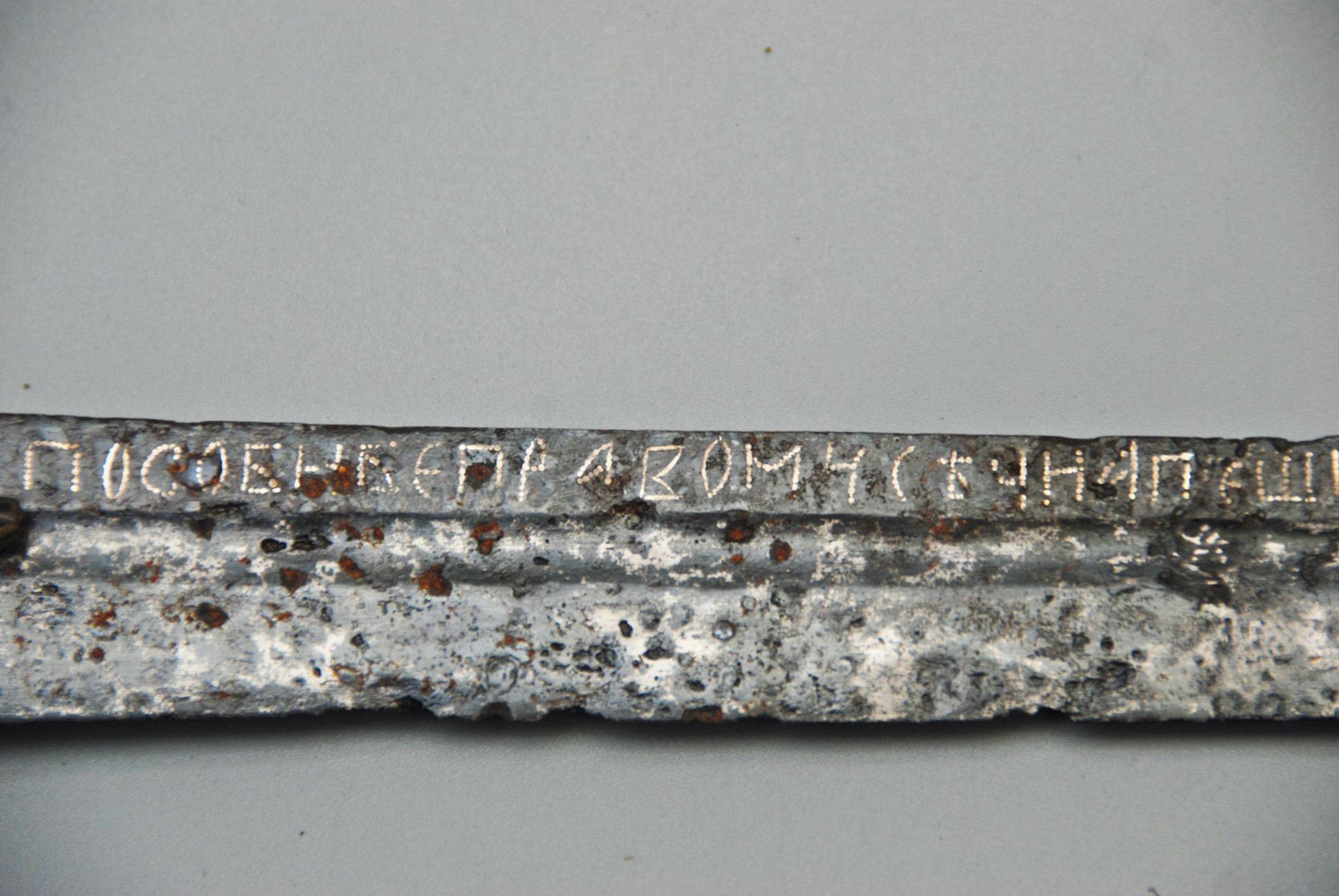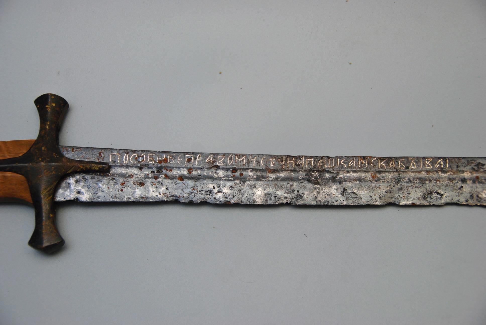 Russian saber, 1400s, on the blade the inscription "Help the right to cut ....." (Пособи правому сечь.....). Wooden handle - modern reconstruction.