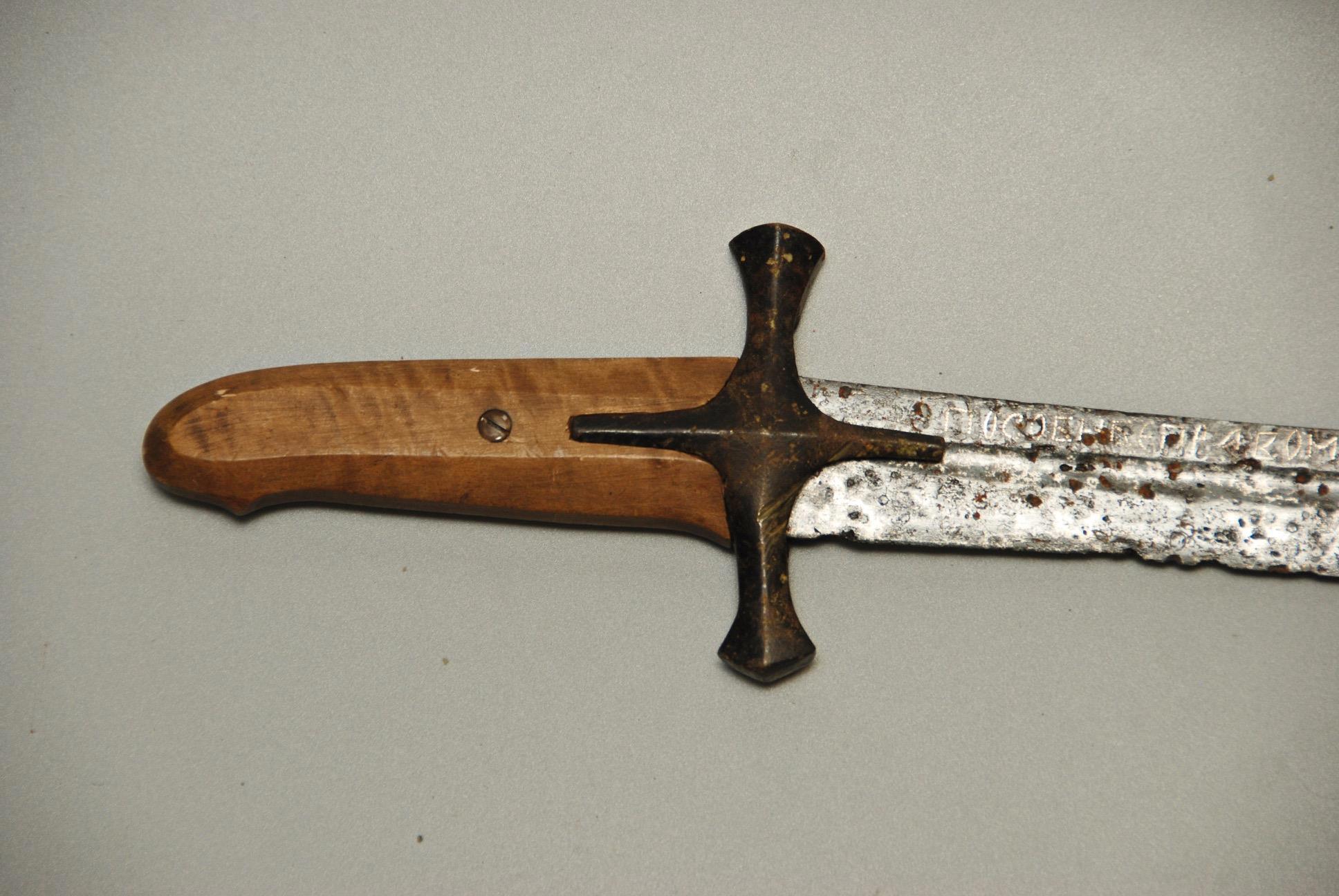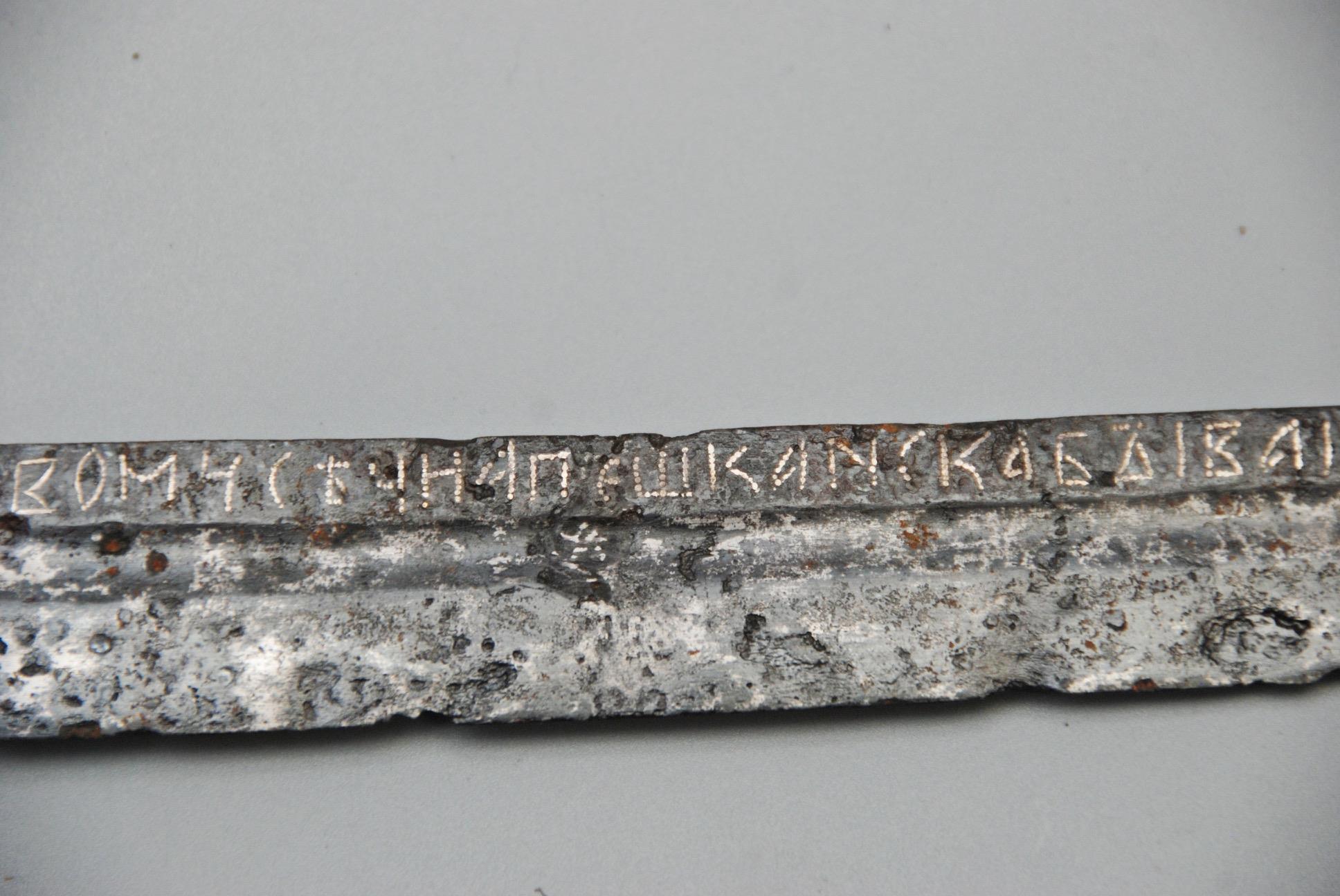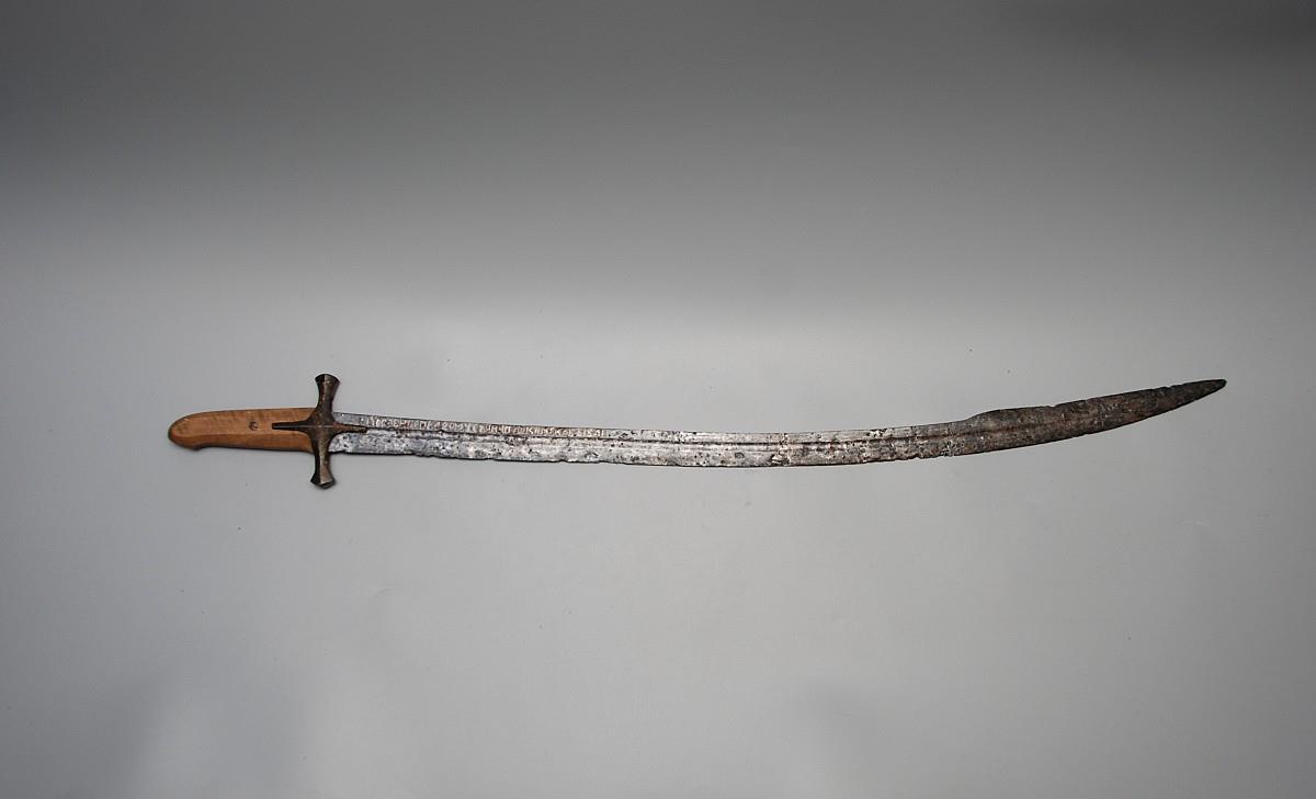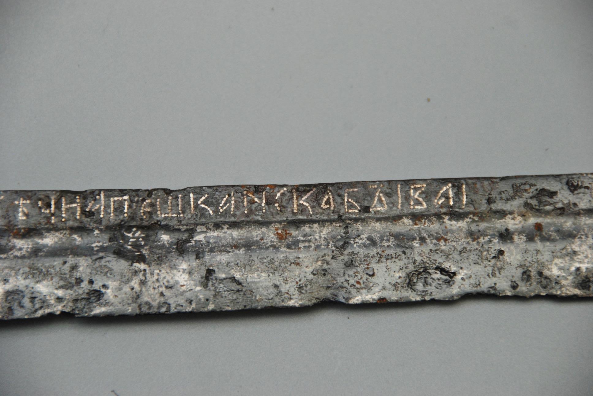 Russian saber, 1400s, on the blade the inscription "Help the right to cut ....." (Пособи правому сечь.....). Wooden handle - modern reconstruction.