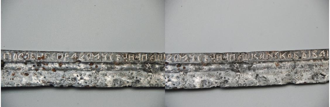 Автор: saganshyПопалось вот на просторах Сети. Выставлено и продано на одном из аукционов. Сабля русская, 1400-хсотые годы. И деревянная рукоять - современная рекунструкция... Ну и надпись имеется.