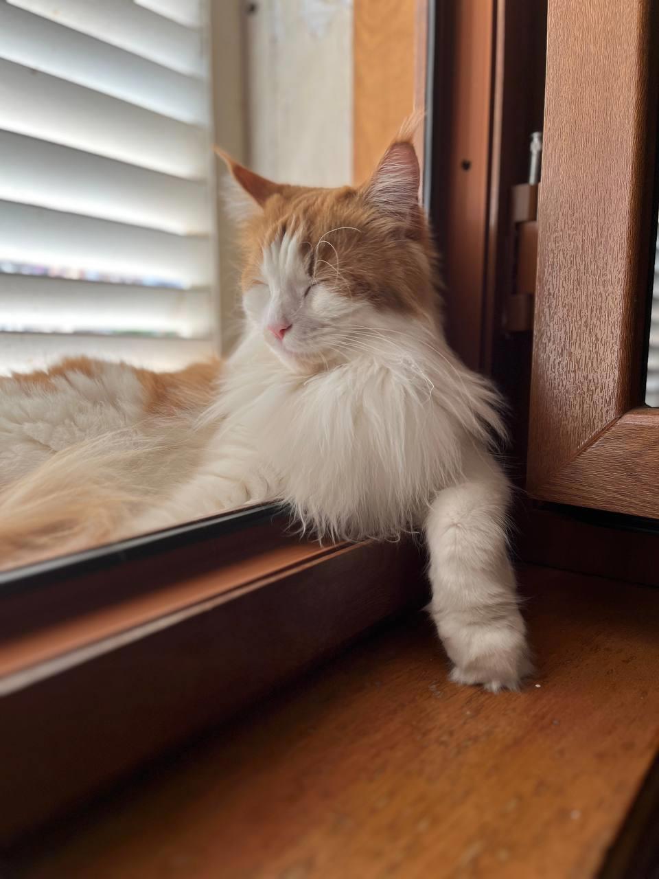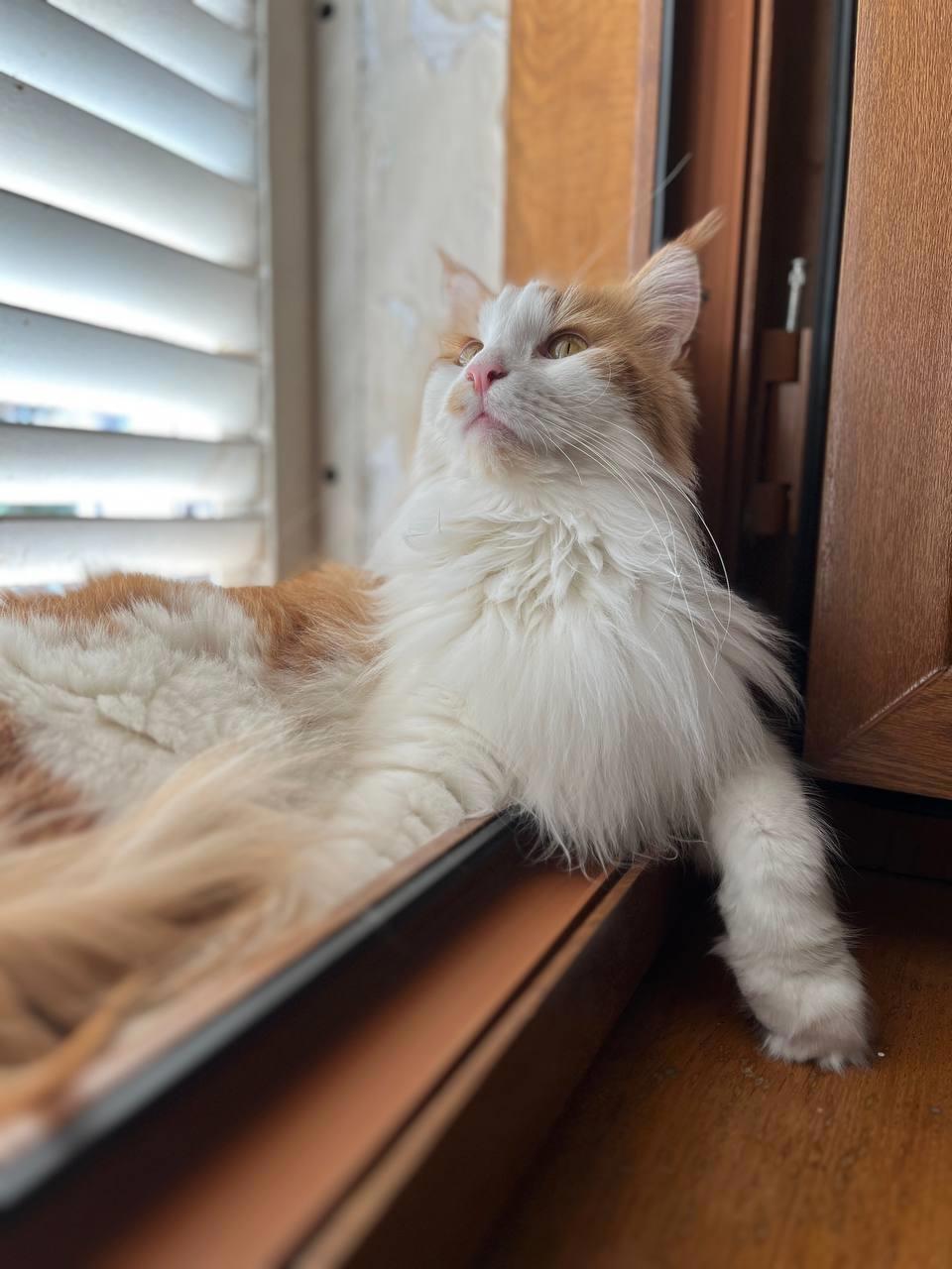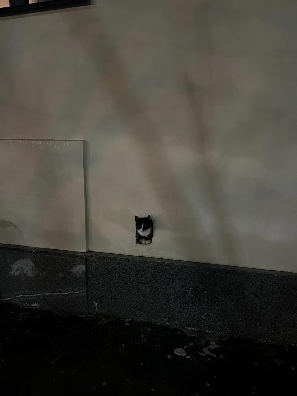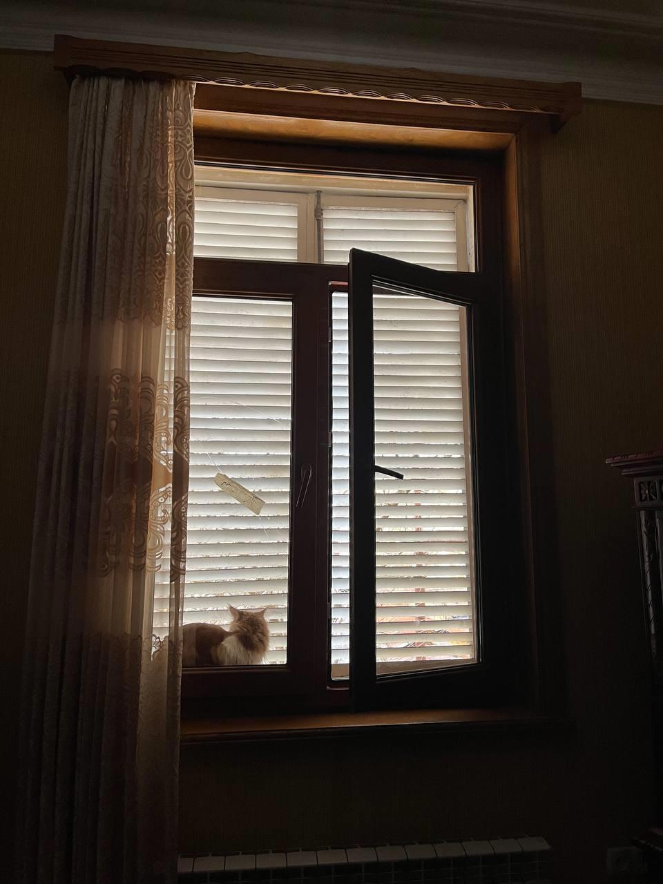 Котик прячется от дождя. На самом деле, он домашний и живёт в квартире на первом этаже в этом доме. Когда он возвращается с прогулки, мяукает под окном и его забирают.