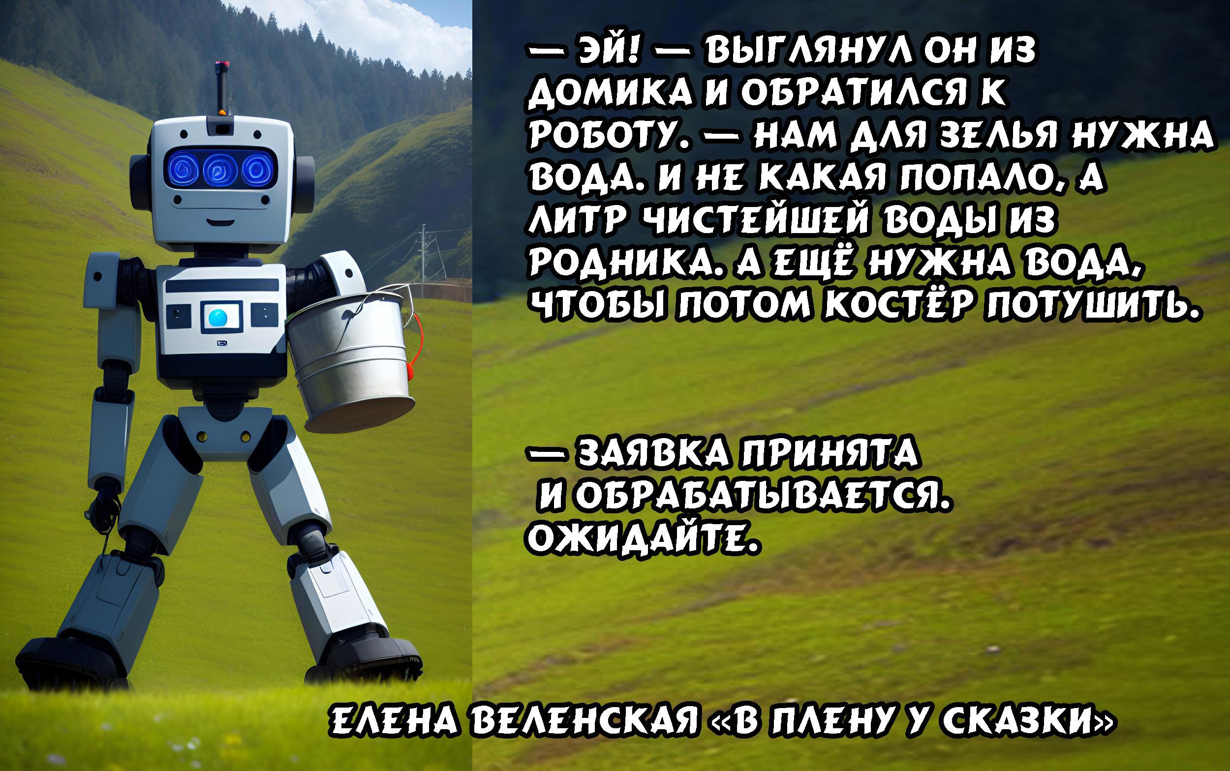 — Эй! — выглянул он из домика и обратился к роботу. — Нам для зелья нужна вода. И не какая попало, а литр чистейшей воды из родника. А ещё нужна вода, чтобы потом костёр потушить.