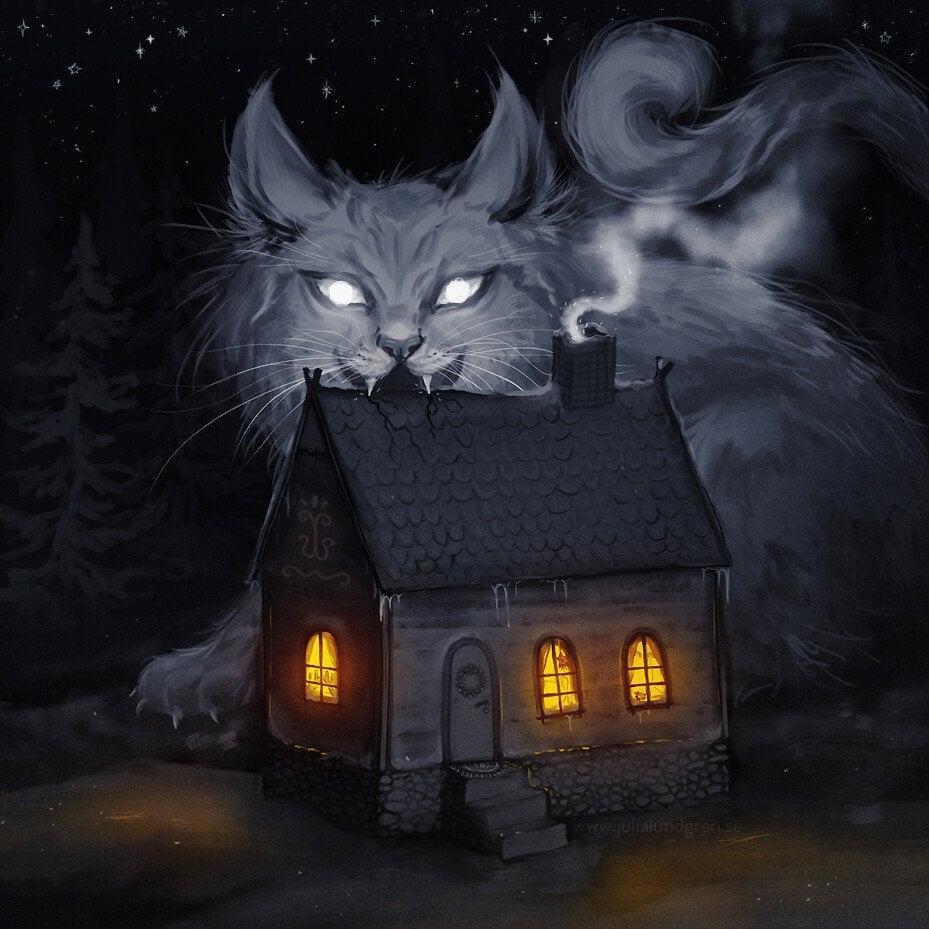 В частности, в Исландии отлично прижилась легенда о Йольском коте. И это не мимшный домашний любимец, а огромный черный кот, который жестоко воспитывает нерадивых детишек и не только детишек, а всех ленивцев, которые к Йолю не связали теплых варежек и носков (кстати, викинги действительно вязали, причём иглой, причем даже мальчики и мужчины).