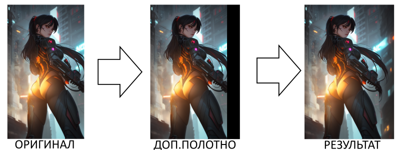 Автор: Евгений НеттВ этот раз мы продолжаем ковырять прошлое изображение на предмет центрирования. Для этого мы поступаем крайне банально: полотно оригинального изображения увеличиваем и получившуюся пустую область заливаем любым цветом на ваш выбор, хоть серобурмалиновым. Результат отправляем в inpaint, закрашивая маской область, которую нужно переработать нейросетью.