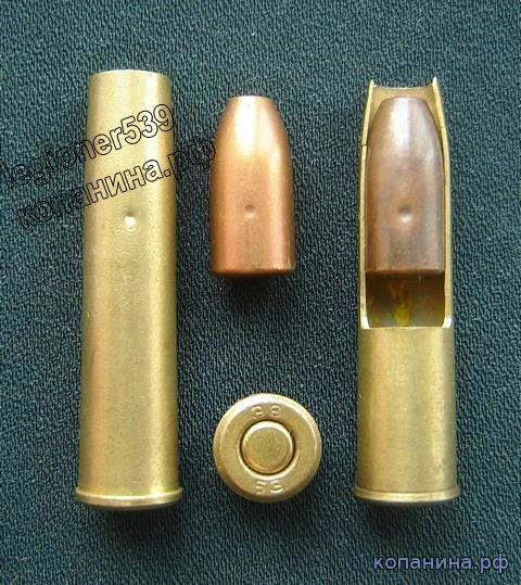 Этот патрон вдвигается в ствол и барабан также прижимается к выступу ствола, обеспечивая плотное обжатие. Вот на фото - гильза в стволе и виден выступ ствола. Вся мощь пороховых газов - работает на выстрел. Ничего в щель между барабаном и стволом не улетает. Такая пуля лошадь валит. Или летит далеко и точно.