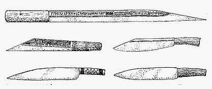• Ярославское Поволжье, найден один нож, датировка 10 в. Общая длинна 43 см., могильник Михайловский;