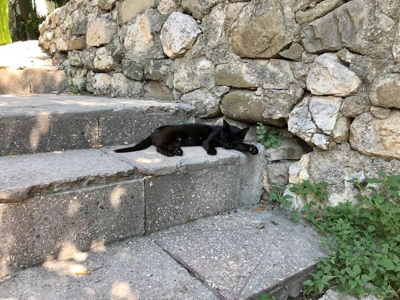 Гурзуф действительно контрастен, но при этом неимоверно уютен и обаятелен. Недаром на каждом углу здесь можно встретить дремлющего котика. Зимой им, наверное, не до сна, но летом, когда толпы туристов так и норовят расстаться с вкусняшками, бедные коты вынуждены жрать в три горла и начисто забывают охотничьи инстинкты. Даже на старом кладбище, вокруг которого и разросся современный Гурзуф, как пончик вокруг дырки, им приносят еду, и несчастным котам не приходится разрывать могил.