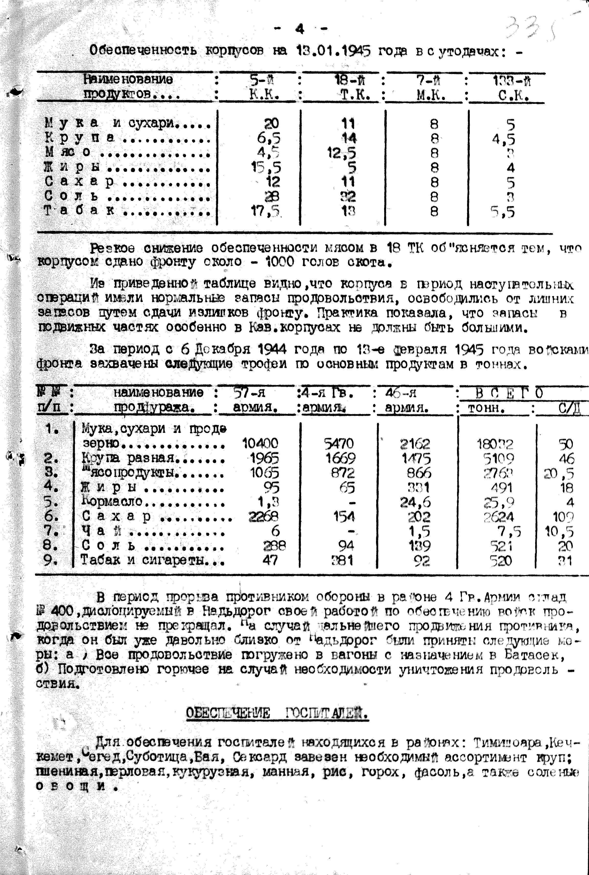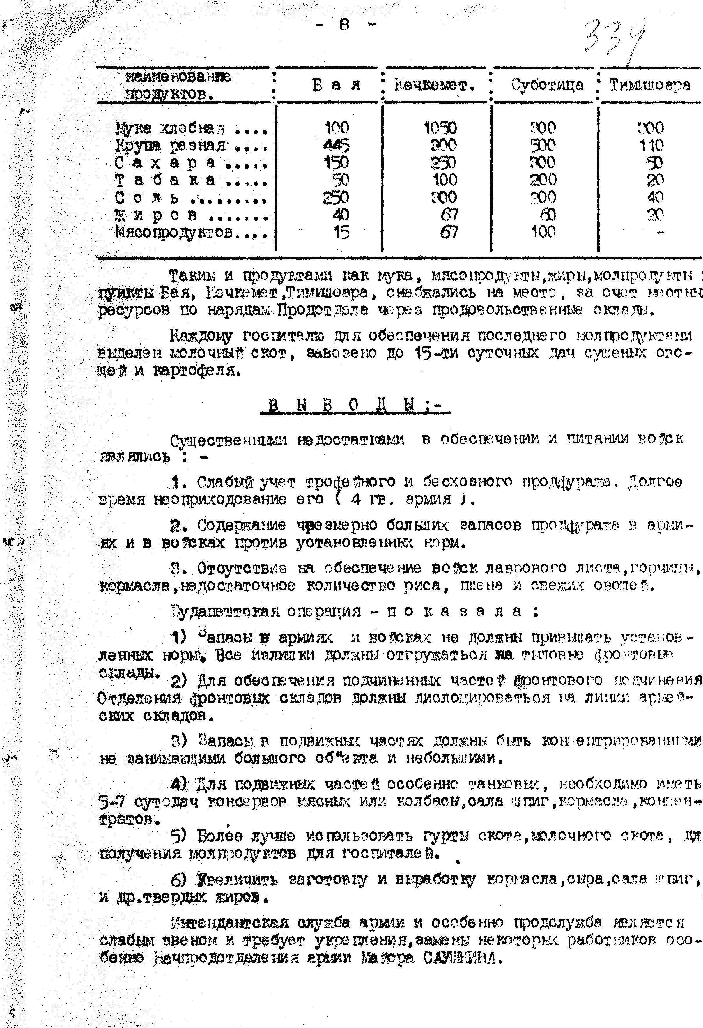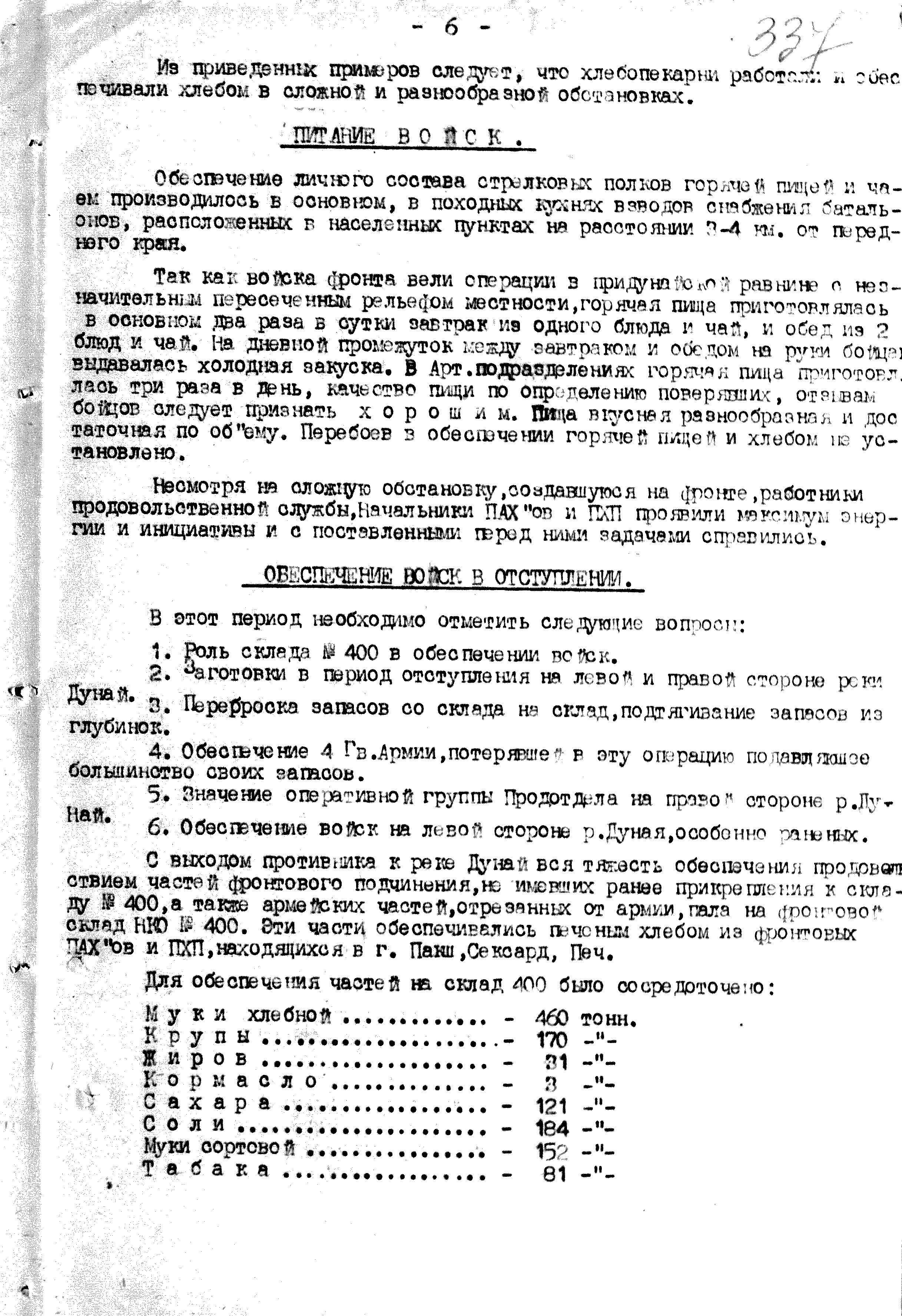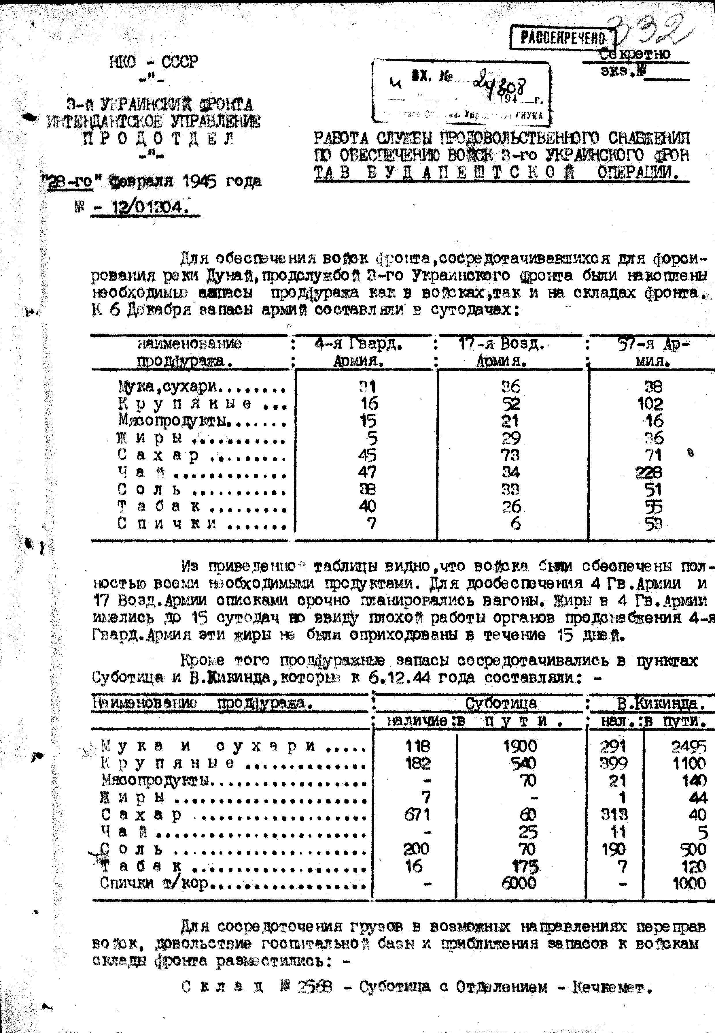 Потому и ценны два сохранившиеся в архивах доклада продовольственного отдела Интендантского управления 3-го Украинского фронта о работе службы продовольственного снабжения в Будапештской и Венской операции. Сегодняшний рассказ, точнее документ, посвящен Будапештской операции.