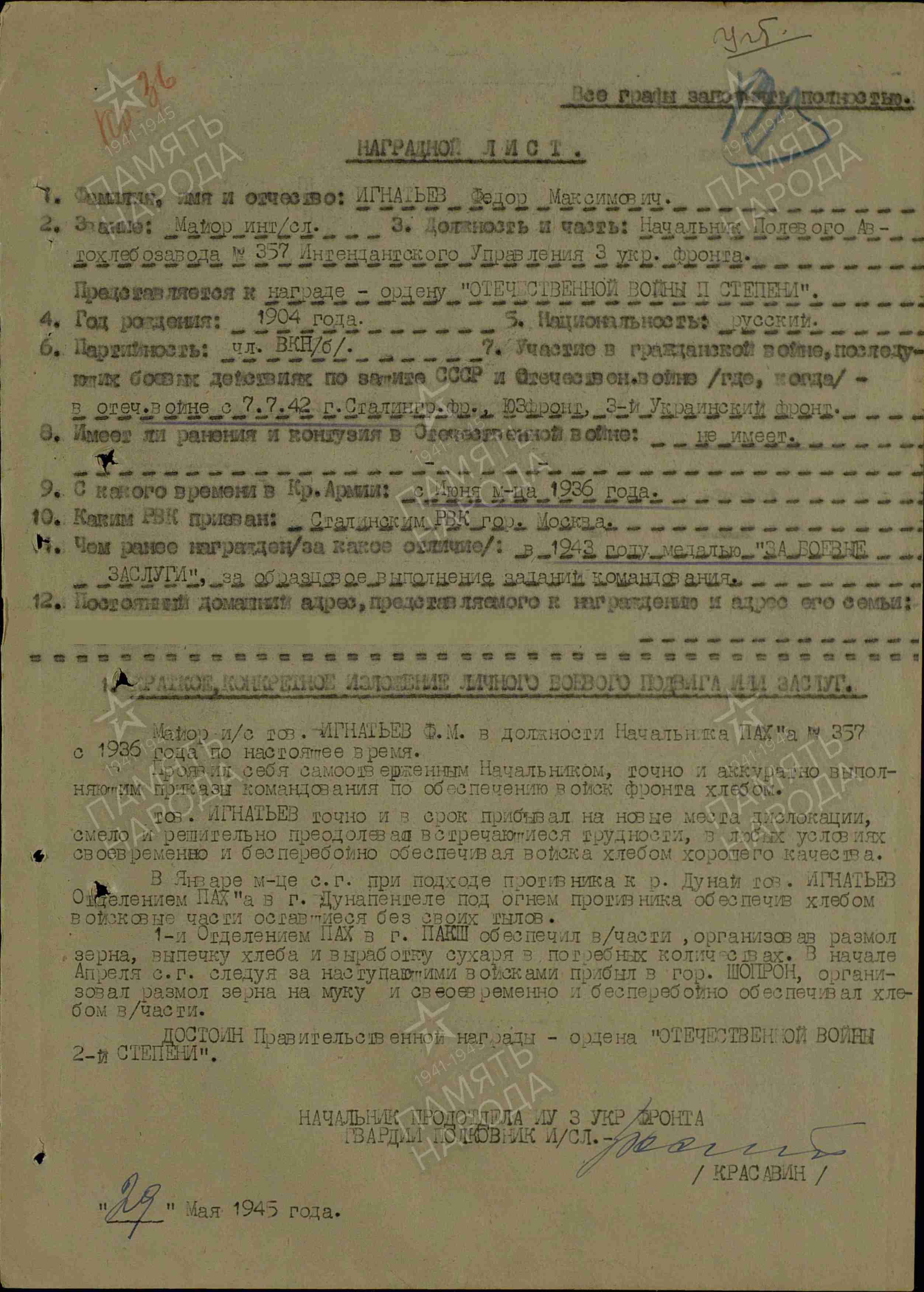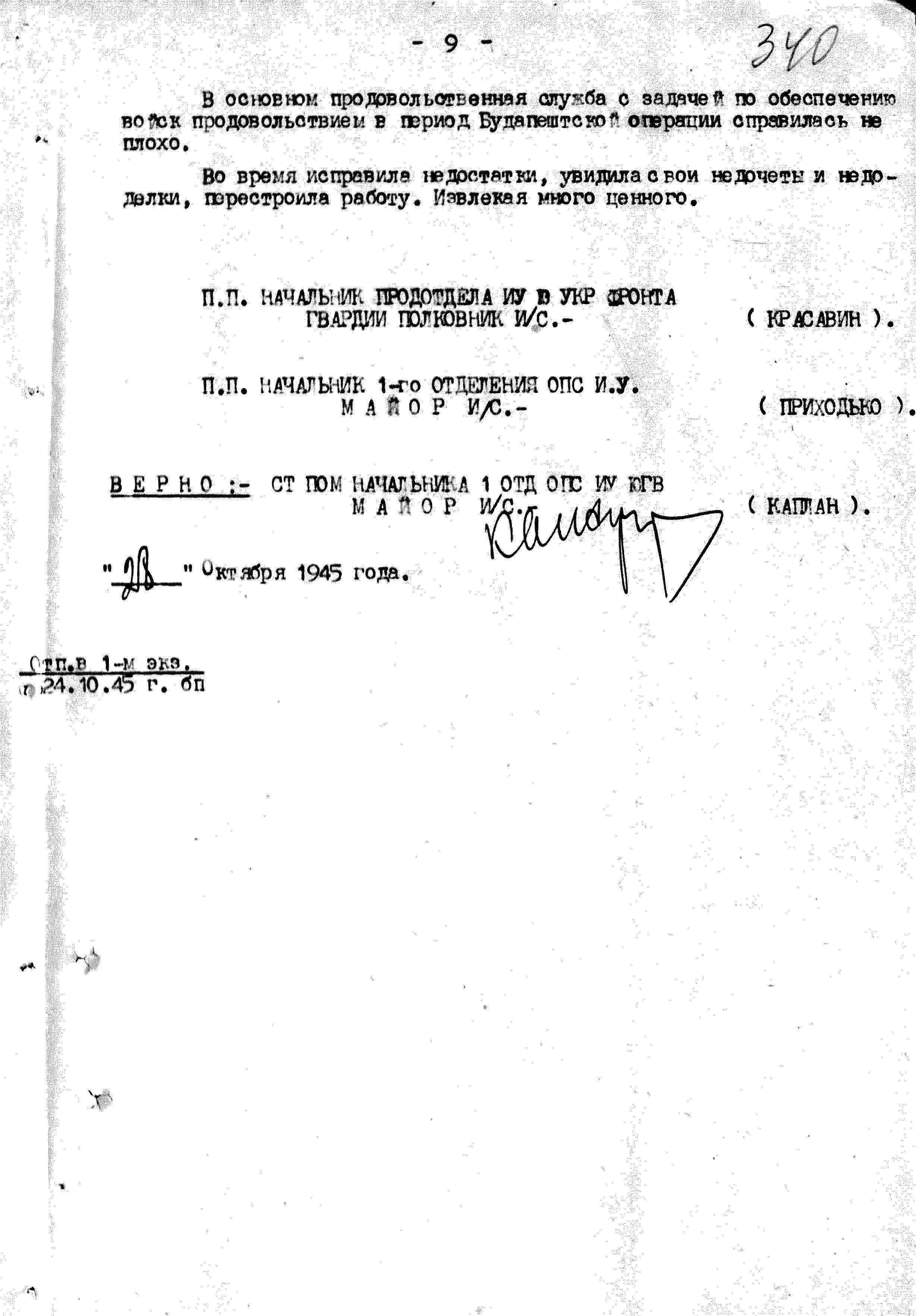 Подписал документ начальник продслужбы фронта 3-го Украинского фронта - гв. полковник инт. службы Красавин Николай Иванович. Войну Николай Иванович начал начальником продслужбы 81 стрелковой дивизии Киевского особого военного округа. Участник обороны Сталинграда, освобождения Белграда, Будапешта, Вены.