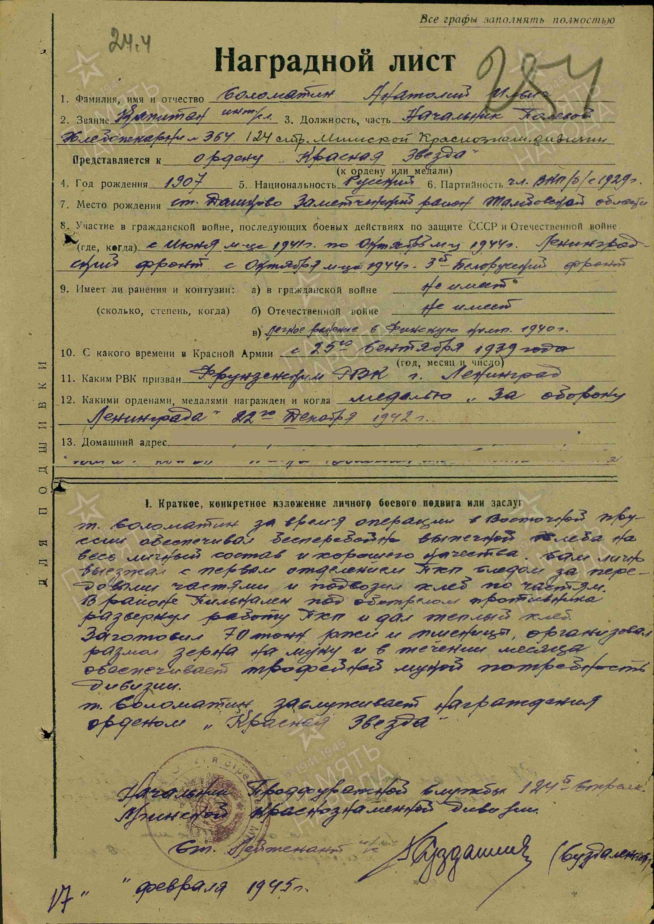 364 ПАХ командовал капитан инт. сл. СОЛОМАТИН Антон Ильич, участник обороны Ленинграда, сражений в Восточной Пруссии: