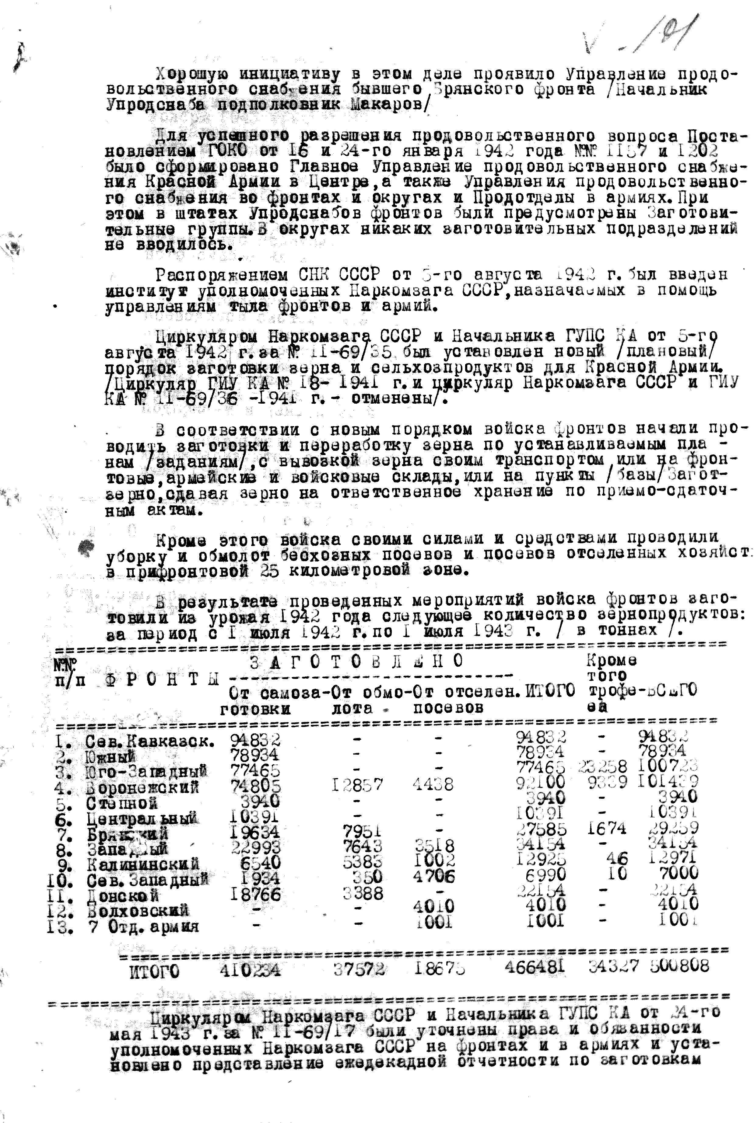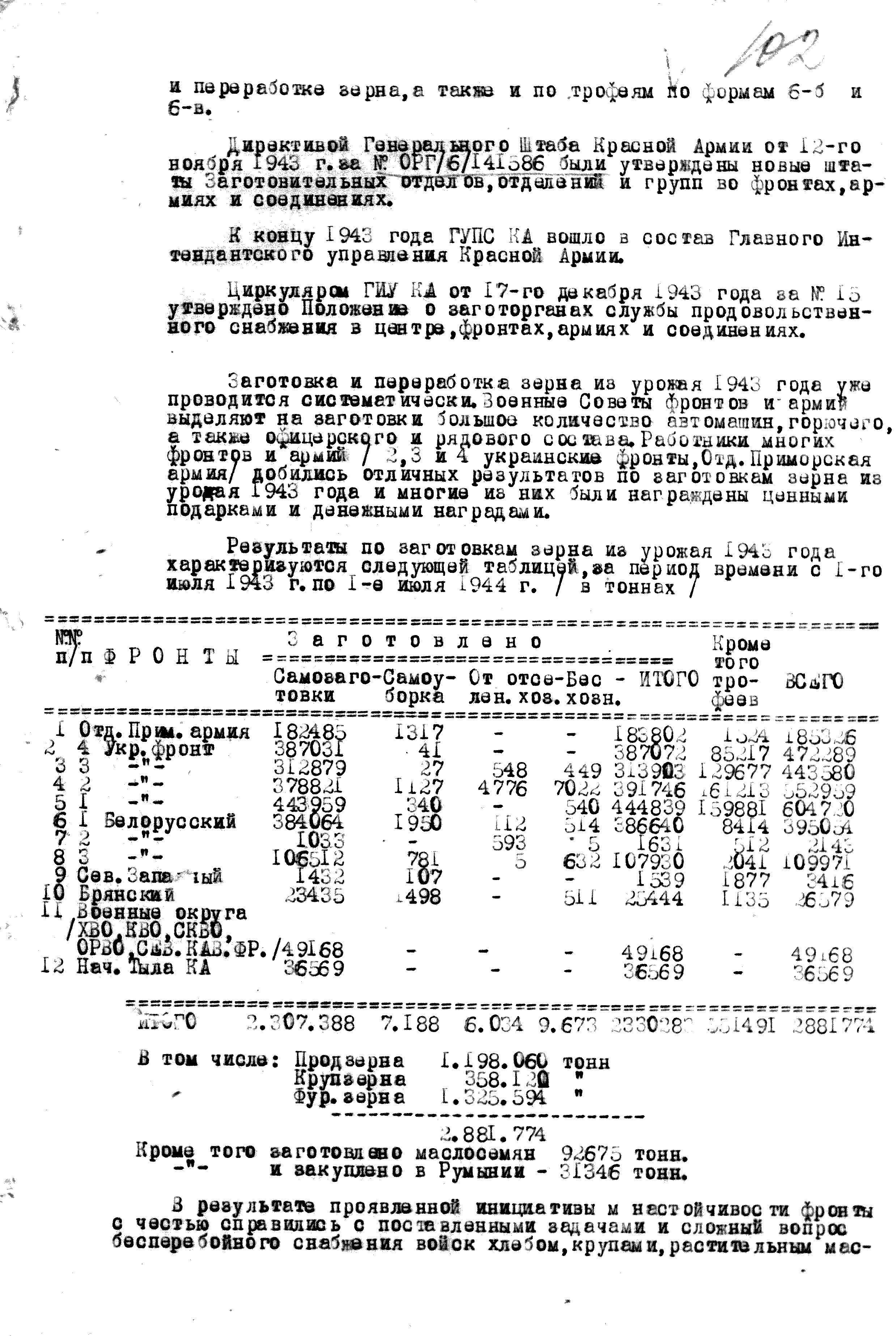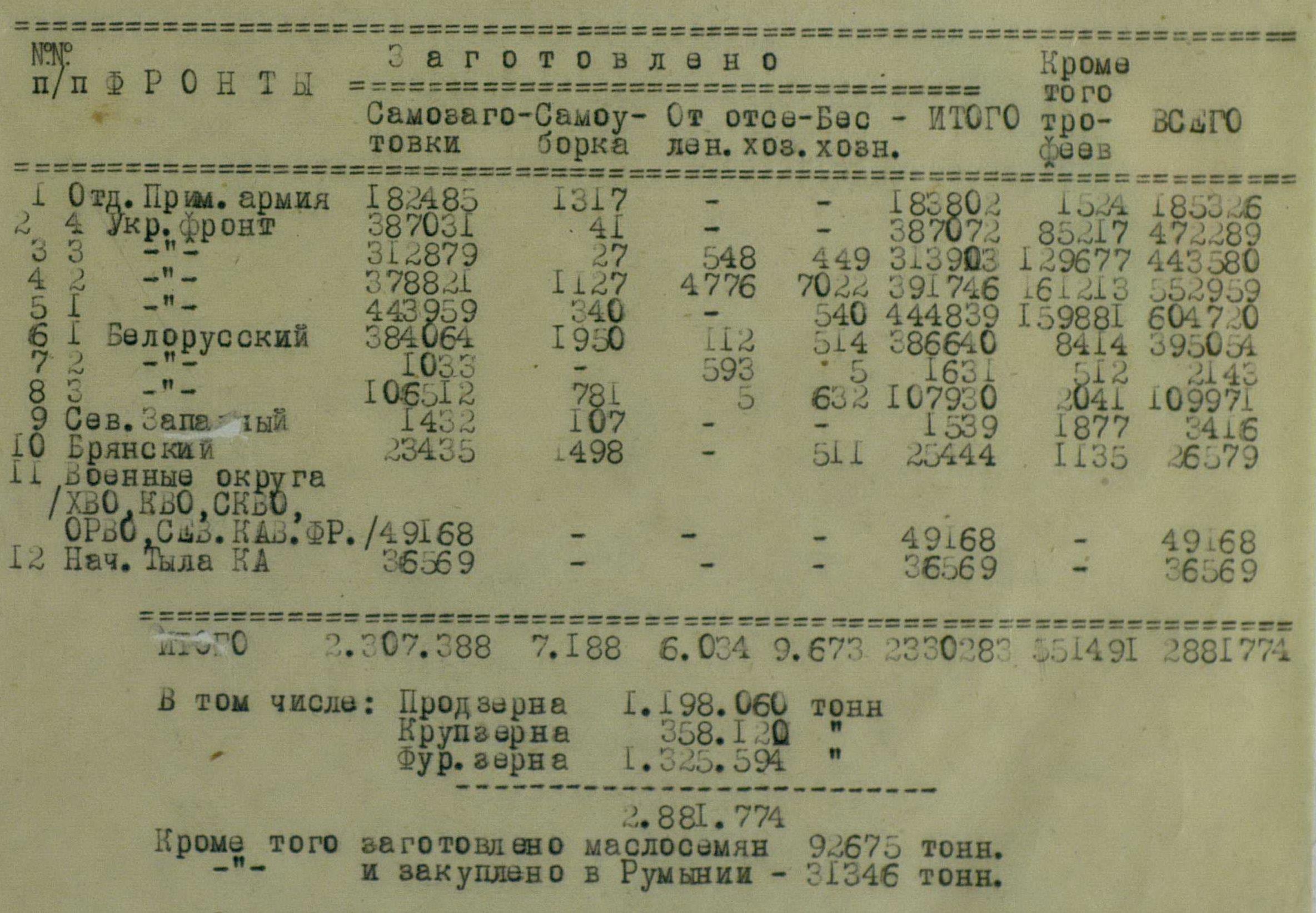 Заготовка и переработка зерна из урожая 1943 года уже проводится систематически. Военные Советы фронтов и армий выделяют на заготовки большое количество автомашин, горючего а также офицерского и рядового состава. Работники многих фронтов и армий (2, 3 и 4 украинские фронты, Отд. Приморская армия) добились отличных результатов по заготовкам зерна из урожая 1943 года и многие из них были награждены ценными подарками и денежными наградами.
