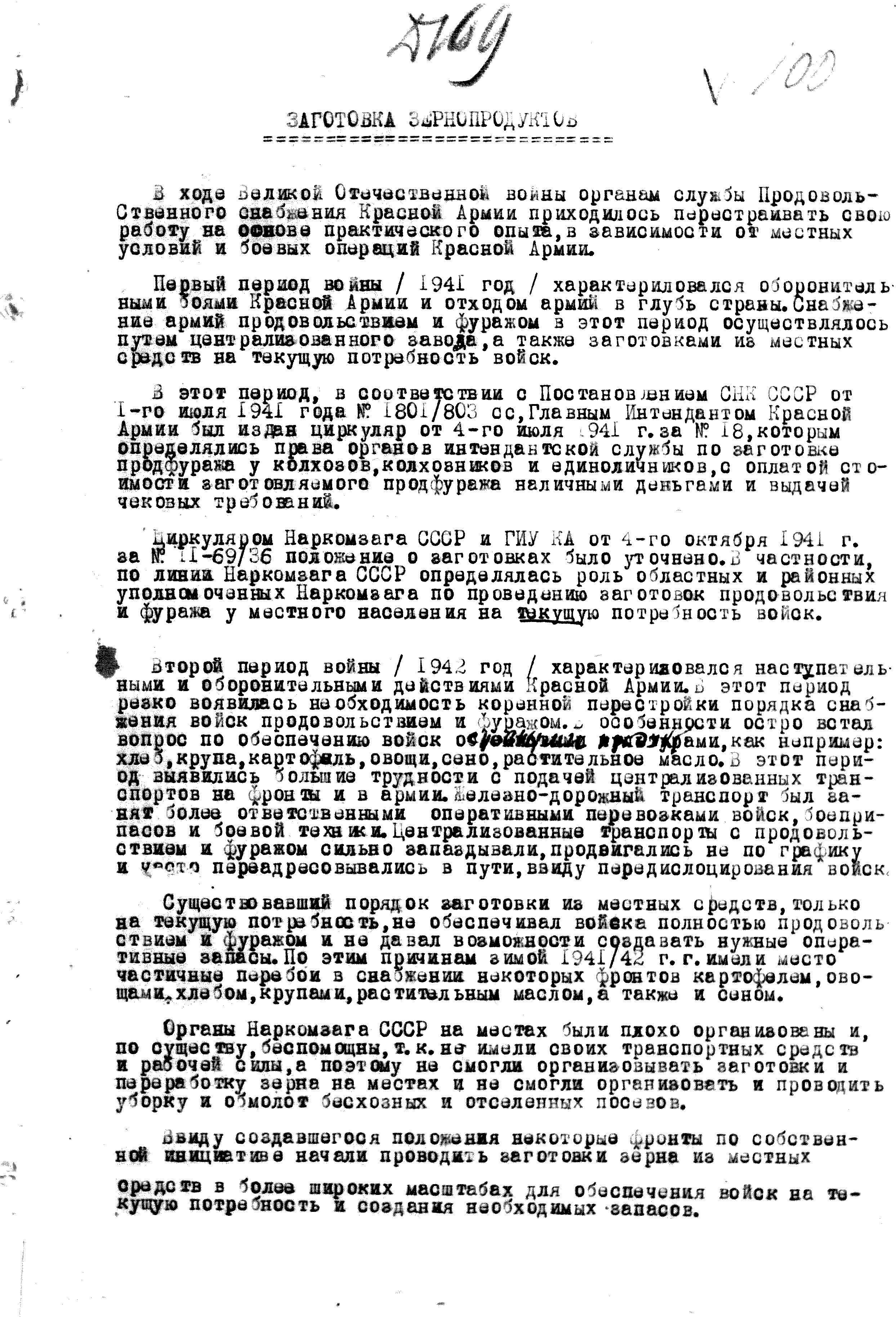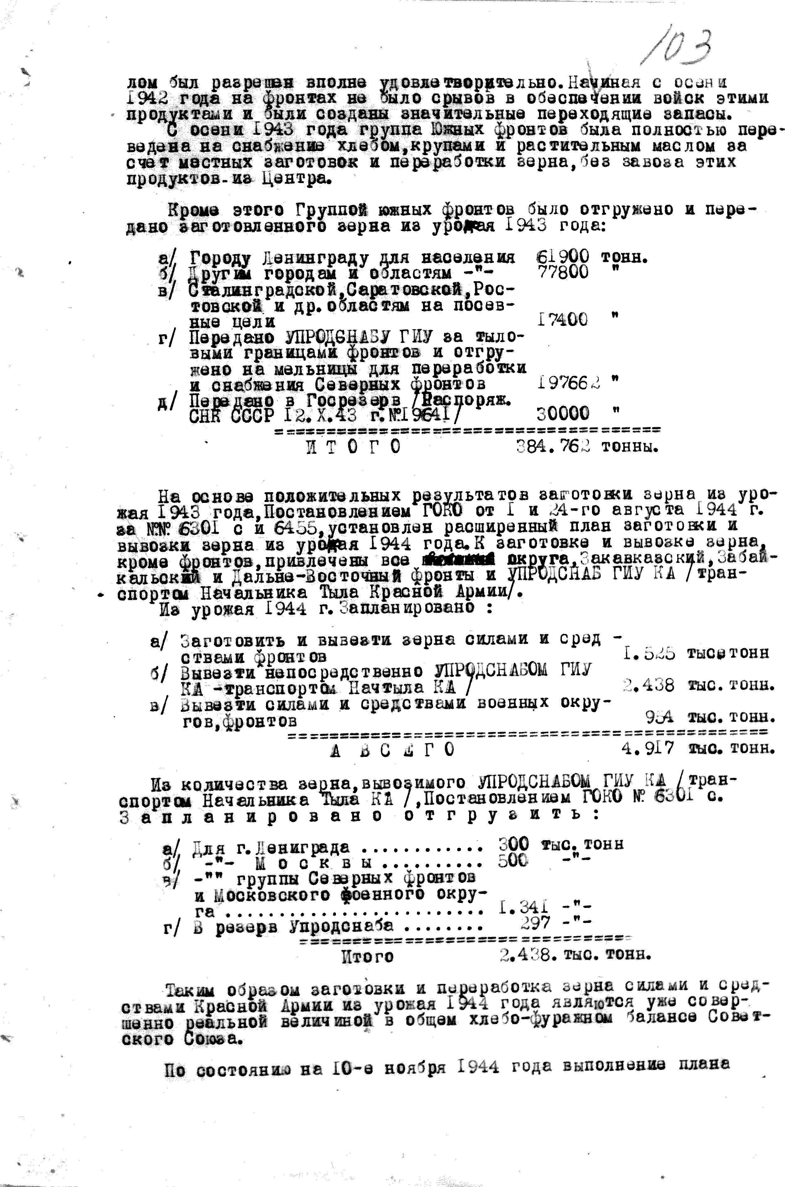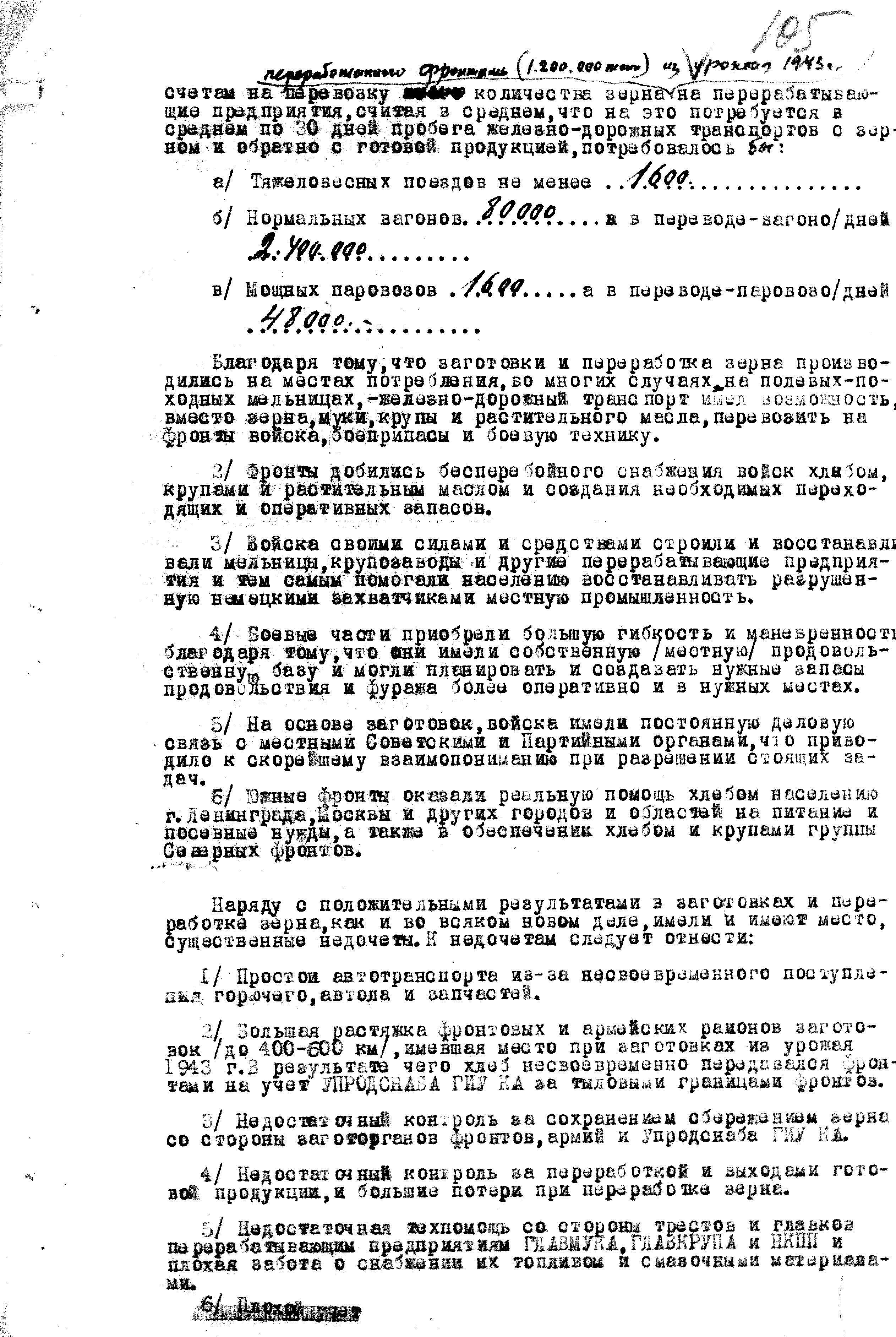 Заготовка и переработка зерна из урожая 1943 года уже проводится систематически. Военные Советы фронтов и армий выделяют на заготовки большое количество автомашин, горючего а также офицерского и рядового состава. Работники многих фронтов и армий (2, 3 и 4 украинские фронты, Отд. Приморская армия) добились отличных результатов по заготовкам зерна из урожая 1943 года и многие из них были награждены ценными подарками и денежными наградами.