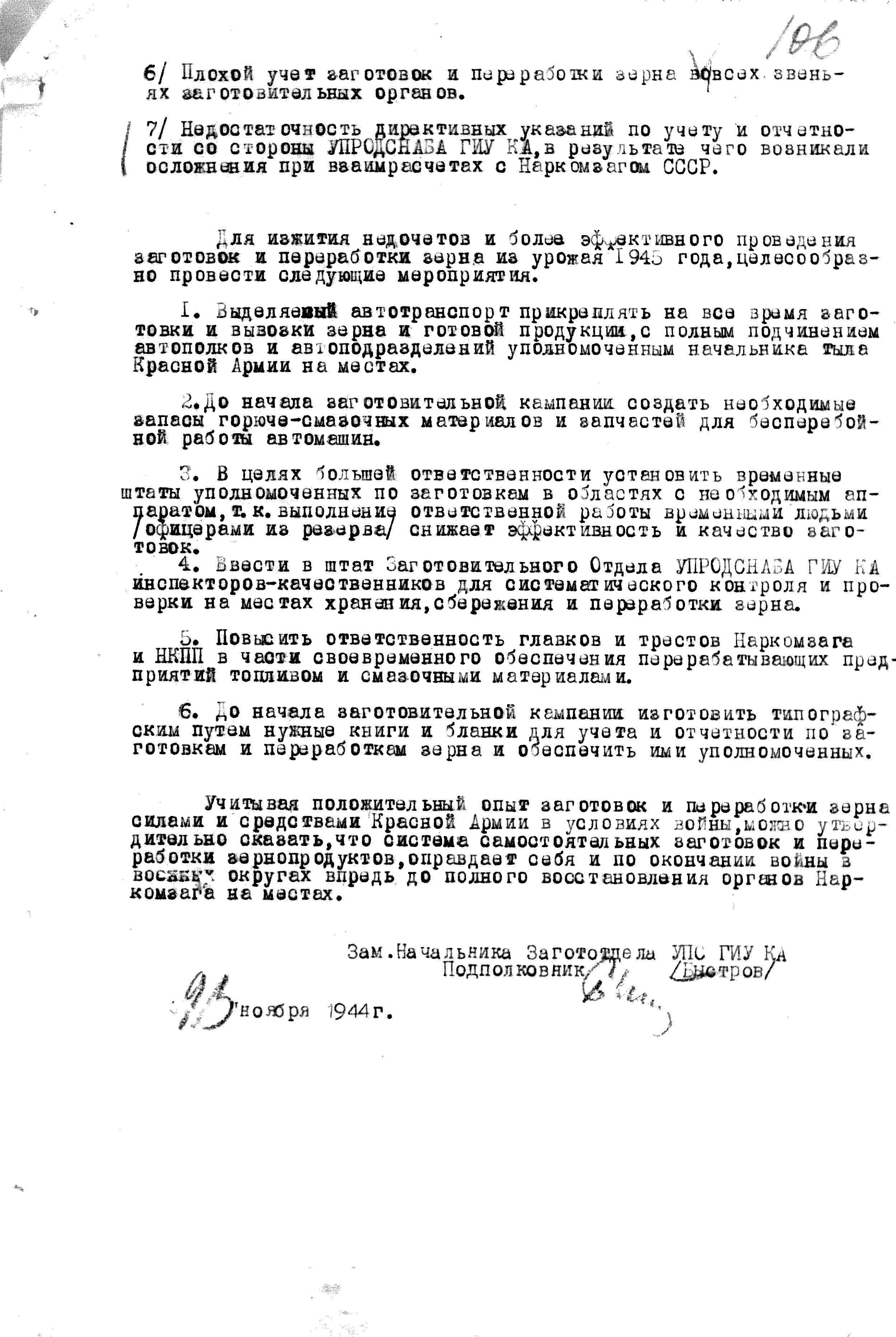 Учитывая положительный опыт заготовок и переработки зерна силами и средствами Красной Армии в условиях войны, можно утвердительно сказать, что система самостоятельных заготовок и переработки зернопродуктов, оправдает себя и по окончании войны в военных округах впредь до полного восстановления органов Наркомзага на местах.