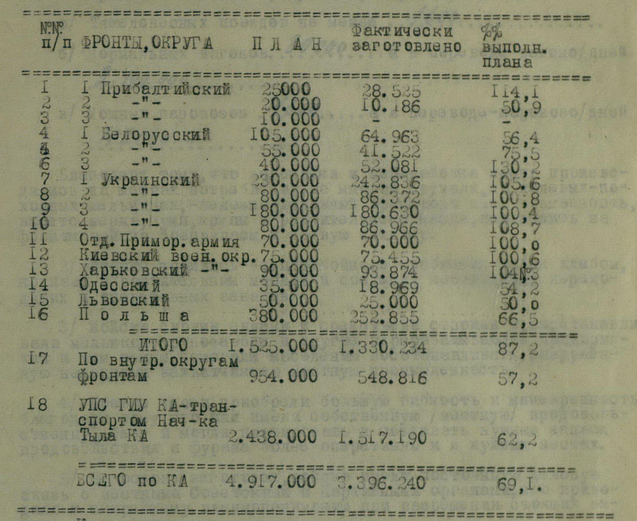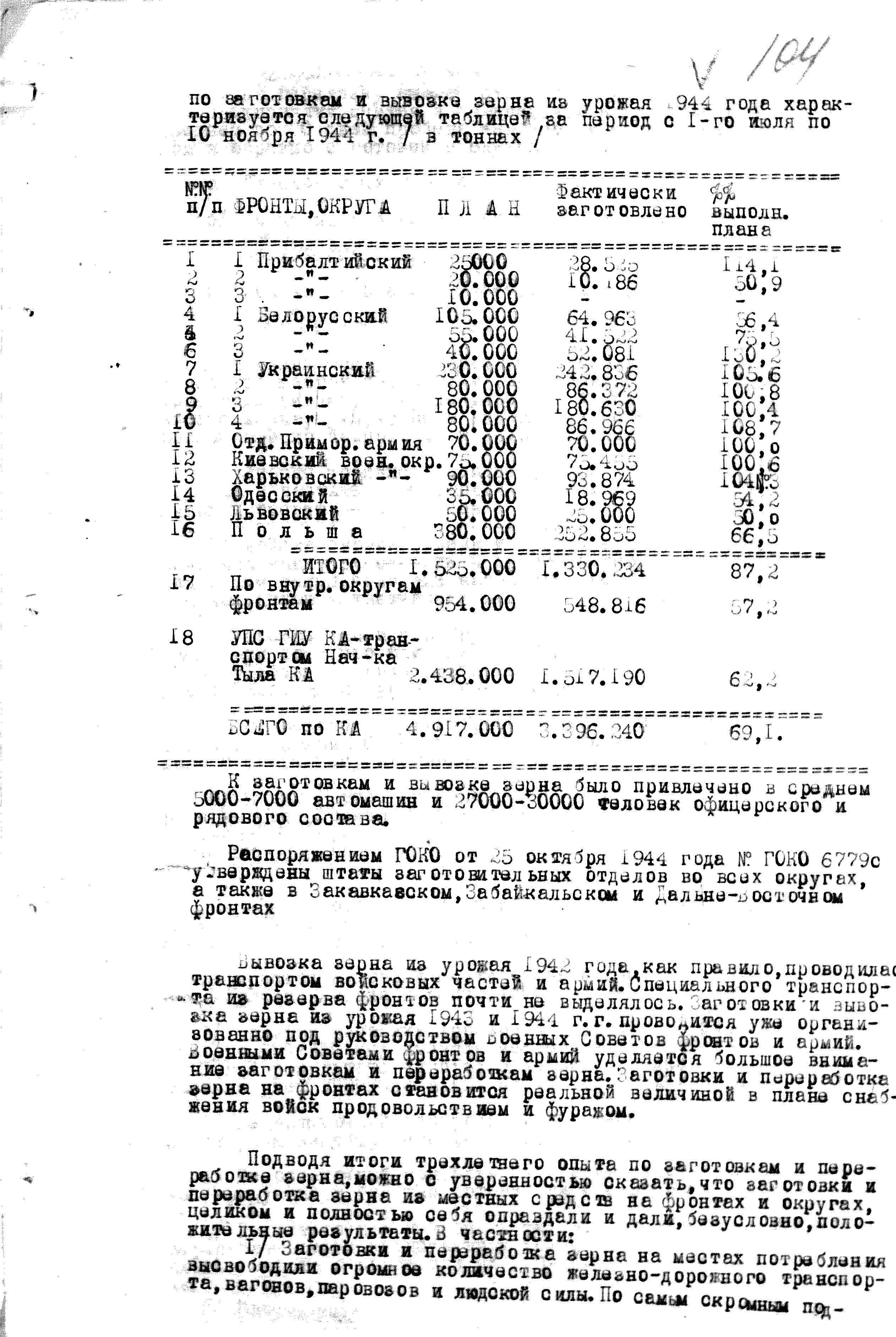 На основе положительных результатов заготовки зерна из урожая 1943 года, Постановлением ГОКО от 1 и 24-го августа 1944 г. за №№ 6201 с и 6455, установлен расширенный план заготовки и вывозки зерна из урожая 1944 года. К заготовке и вывозке зерна, кроме фронтов, привлечены все округа, Закавказский, Забайкальский и Дальне-Восточный фронты и УПРОДСНАБ ГИУ КА (транспортам Начальника Тыла Красной Армии).